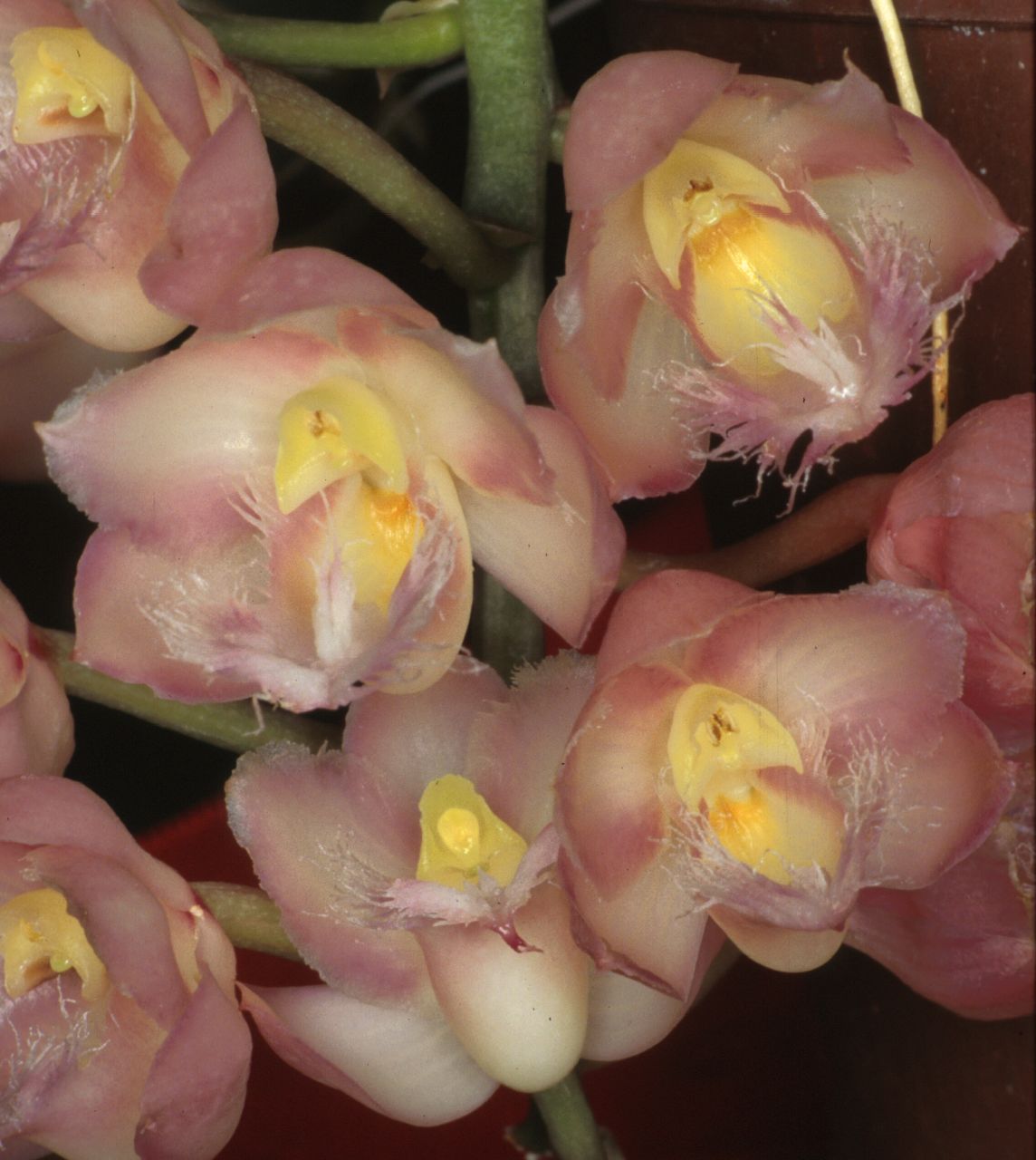 Found in Michoacan and Oaxaca states of Mexico on the Pacific slope in oak forests or tropical deciduous forests at elevations around 500 to 1300 meters as a small to medium sized, warm to cool growing, deciduous leaved epiphyte with pseudobulbs enveloped basally by gray overlapping sheaths and carrying 4 to 5, apical, elliptic-lanceolate, acuminate, flexible, long-attenuate to the articulate base leaves that blooms in the early winter on a short to 4 3/4" [to 12 cm], racemose inflorescence carrying several, campanulate, fragrant [vics vapo rub by day, cinnamon at night] flowers and arises from the base of mature leafless or leafed psuedobulbs.