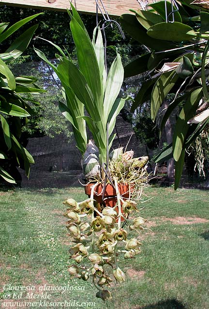 Found in Michoacan Mexico on palms in savannahs often in association with ants nests at elevations of 520 to 1200 meters as a giant sized, warm to cool growing epiphyte with clustered, 7 to 11 internoded, globose to ovoid pseudobulbs enveloped in youth by leaf bearing sheaths each carrying 7 to 11 distichous, deciduous, plicate, narrowly linear-oblanceolate to elliptic-oblanceolate, acuminate, longly attenuate and canaliculate base leaves that blooms in the late spring and early summer arising on a newly arising pseudobulb, pendulous, 10 to 15.2" [25 to 38 cm] long, racemose, fairly dense, 9 to 25 flowered inflorescence with amplexicaul, triangular, acuminate, greenish white floral bracts and carrying semi-closed flowers.