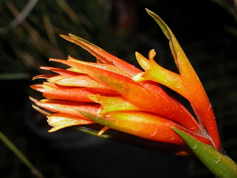 Found in Nicaragua, Costa Rica, Panama and Ecuador in wet oak, cloud forests at elevations of 800 to 2900 meters as a medium sized, warm to cold growing epiphyte or terrestrial that blooms in the fall and early winter on an erect, red, several flowered inflorescence with red, triangular, acute bracts and floral bracts and carrying red to orange flowers