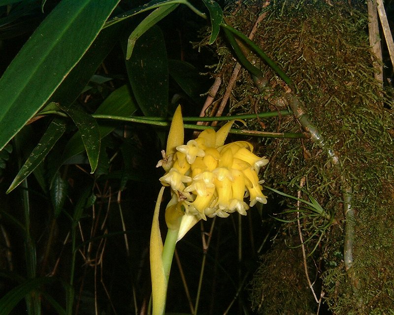 Found in Nicaragua, Costa Rica and Panama in dense, wet, montane primary forests in tall trees at elevations of 400 to 2750 meters as a small to medium sized, warm to cold growing terrestrial? or epiphyte with fleshy and somewhat pilose roots carrying elliptic leaves that have elongate basally clasping petioles that blooms in the spring through fall on a terminal, 6" [15 cm] long, racemose, apically densely compact, many flowered inflorescence arising from a spathe and having 3 to 4 inflated, loose, tubular, acuminate bracts as well as floral bracts that surround the apical ball of variable colored flowers.
