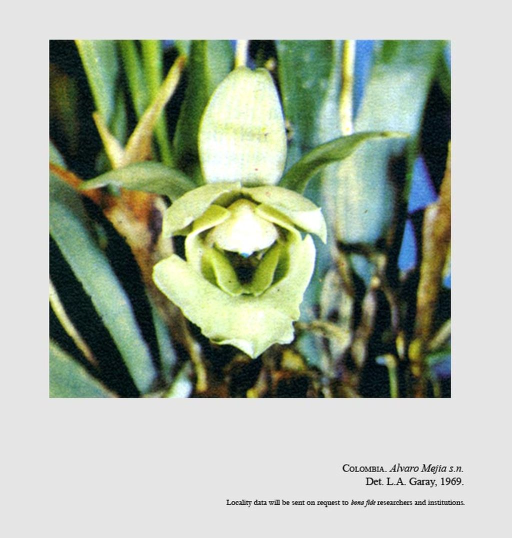 Found in Colombia without location data as a small to medium sized epiphyte with a 4" [10 cm] long, single flowered inflorescence.