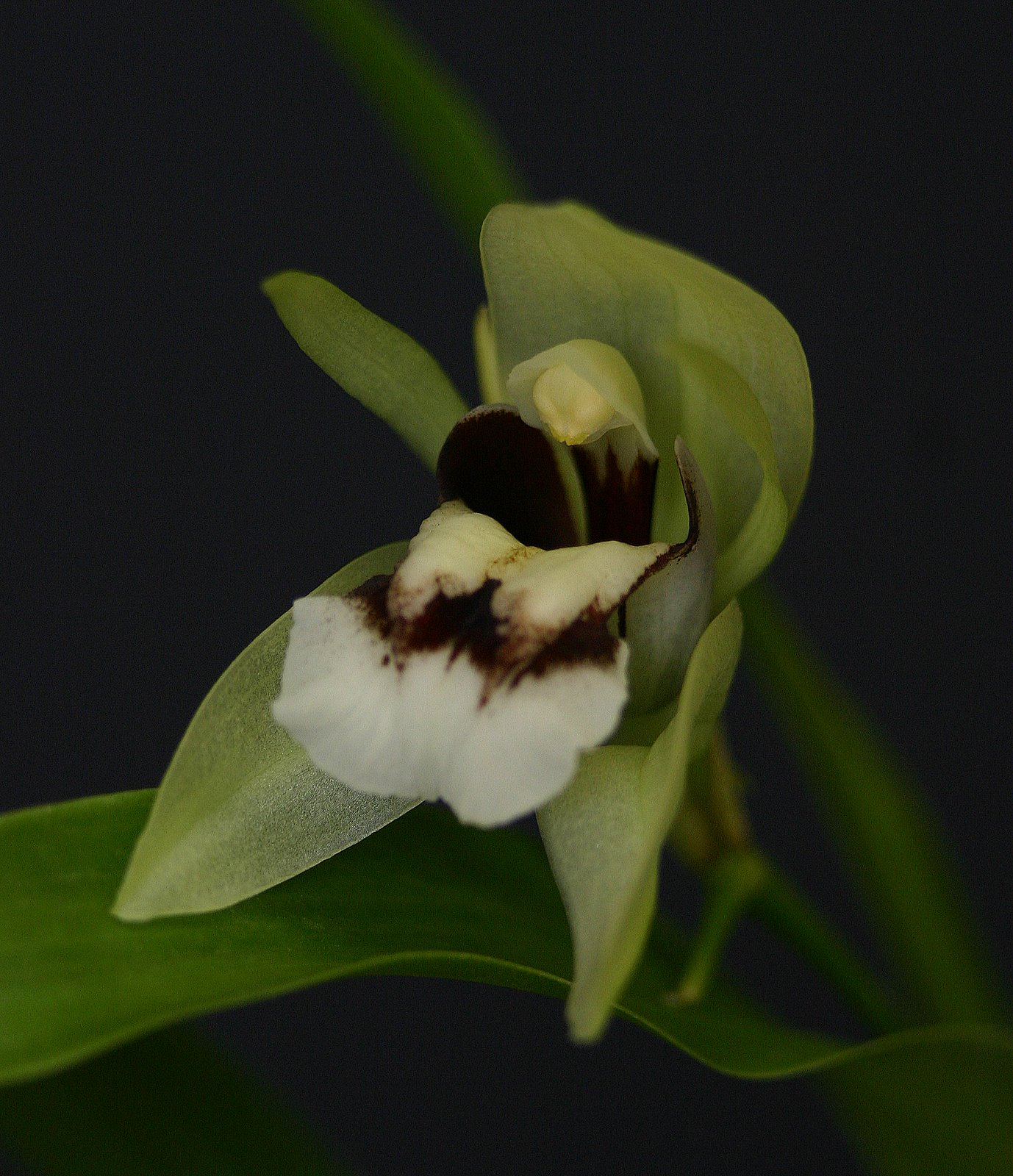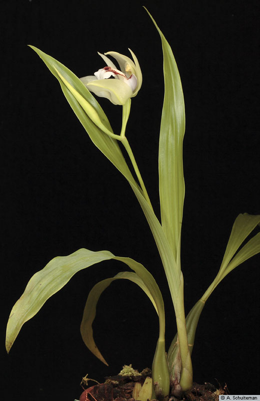 Found in the Bismark Islands, New Guinea and the Solomon Islands in lowland rain forests at elevations of sea level to 1500 meters as a medium sized, hot to cool growing epiphyte or rarely terrestrial with a woody rhizome giving rise to close set, cylindrical-ovoid, smooth, 4 grooved, 4 angled pseudobulbs carrying 2, linear to linear-lanceolate, acuminate, plicate, 7 to 9 nerved, gradually narrowing below into the very elongate, petiolate base leaves that blooms at most any time of the year, often more than once, on a erect to suberect, slender, 20" [50 cm] long, fractiflex rachis, loosely 3 to 7 flowered inflorescence arising on a newly emerging growth with lanceolate, deciduous floral bracts and successively opening flowers.