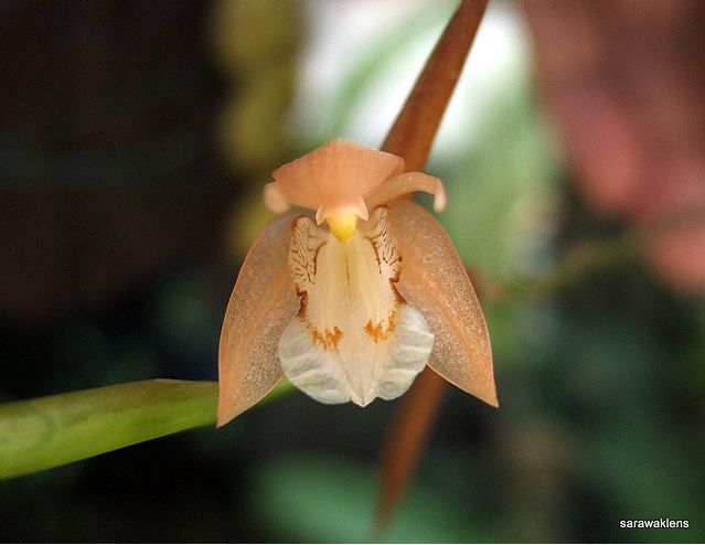 Found in Borneo in lowland rainforests at elevations around 800 meters as a small sized, hot to warm growing epiphyte with a short rhizome giving rise to close set, flask-shaped, basally thicker pseudobulbs carrying 2, oblong-lanceolate, shortly triangular acuminate, acute, narrowing below into an elongate, cuneate, plicate, 7 nerved, grooved, petiolate base leaves that blooms in the summer on a hysteranthous, bare, somewhat strong, compressed, zig-zag, 20" [50 cm] long, many flowered, 2 ranked inflorescence with deciduous, coriaceous floral bracts and carrying successively opening, fragrant flowers