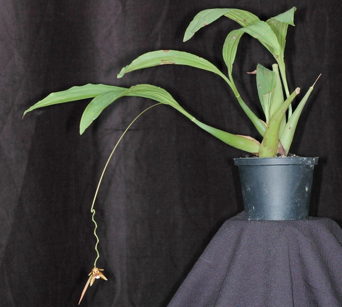 Found on Mindanao Island of the Philippines at elevations around 1500 meters as a medium sized, cool growing epiphyte with close set, linear, tapering pseudobulbs carrying 2, narrowly elliptic to lanceolate, petiolate base leaves that blooms in the late spring and early summer on a terminal, erect then arching, arising with a new growth, to 12" [30 cm] long, rachis zig-zag, successively many flowered inflorescence with deciduous chafflike floral bracts.