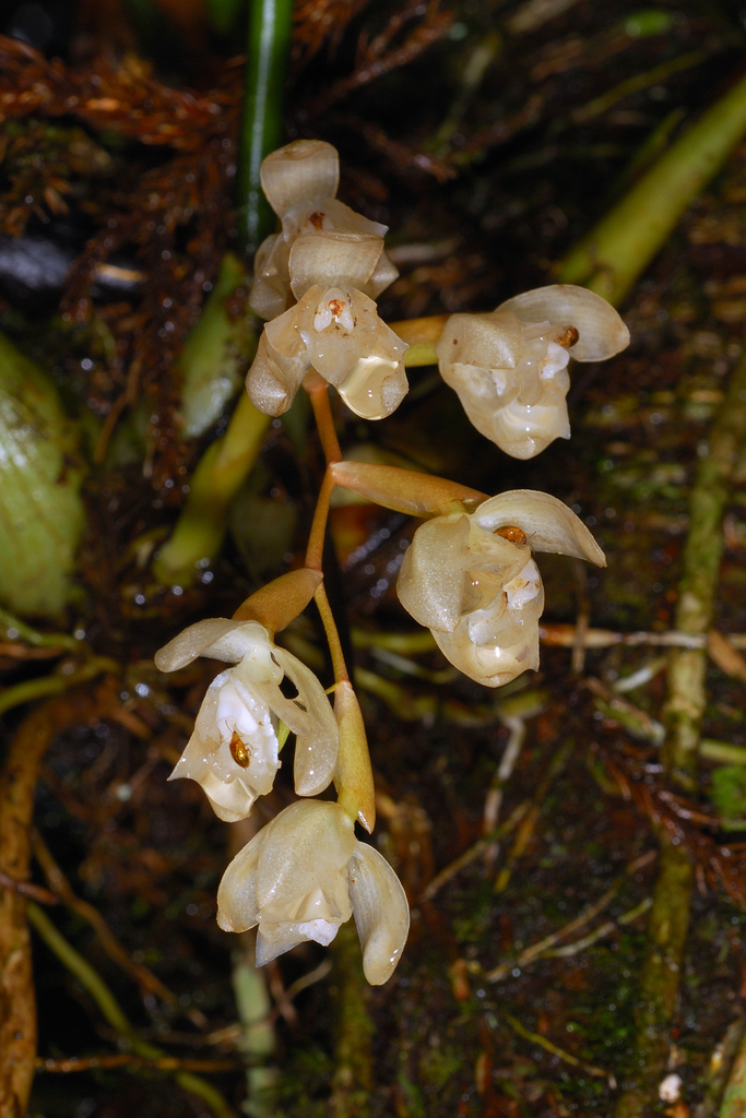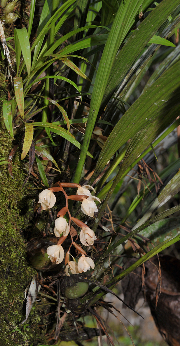 Found in Sabah, Borneo in hill, lower and upper montane mossy forests at elevations of 800 to 2400 meters as a medium sized, warm to cold growing epiphyte with slender, pyriform to cylindrical pseudobulbs carrying a single, apical, linear-oblong to oblong, abruptly acuminate, erect, rigid, strongly plicate, 7 nerved, coriaceous, gradually narrowing below into the elongate, deeply grooved, petiolate base leaf that blooms in the spring on a 7" [17.5 cm] long, suberect, fractiflex rachis, loosely 5 to 7 flowered inflorescence arising on a mature pseudobulb and has persistent floral bracts and simultaneously opening, fragrant flowers.