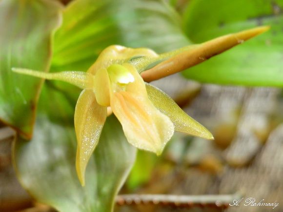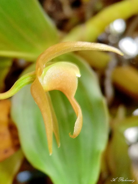 Found in western Sumatra in lower mintane forests at elevations around 1200 meters as a small sized, cool growing epiphyte with a creeping rhizome with 1 to 1.6" [2.5 to 4 cm] between each flask shaped, at an acute angle to the rhizome pseudobulbs carrying 2, apical, thin, narrowly lanceolate, acute, abruptly narrowing below into the petiolate base leaves that blooms in the fall on an erect, arising with the leaves, rachis to 13.2" [33 cm] long, 18 to 23.8" [45 to 59 cm] long overall, successively single, few flowered inflorescence.