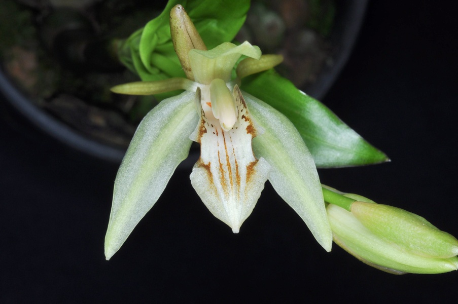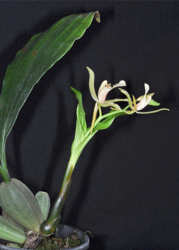 Found in Myanmar and Vietnam at elevations around 1200 to 1300 meters as a miniature to small sized, cool growing epiphyte with ovoid to fusiform carrying 2 apical, oblong-lanceolate, acuminate, coriaceous, 7 nerved leaves that blooms in the fall, arising on a newly developing pseudobulb, 3.2" [8 cm] long, zig-zag, successively 2 to 5 flowered inflorescence