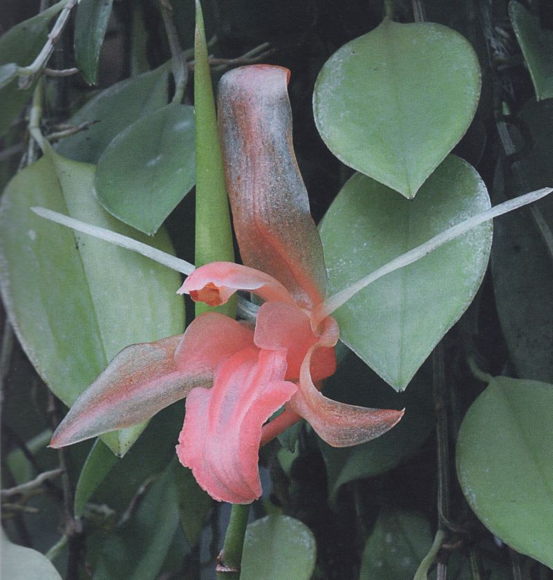 Found in Sabah and Sarawak Borneo at elevations around 600 meters as a small sized, warm growing epiphyte with .4" [1 cm] between each narrowly ellongate ovoid, slightly laterally flattened pseudobulbs enveloped basally by imbricating bracts and carrying 2, oblong-lanceolate, acute, leathery, 5 strong nerved, grooved and 3 ribbed petiolate base leaves that blooms in the later summer on a hysteranthous, peduncle bare, slender, elliptic in cross-section, 2 to 4.8" [5 to 12 cm] long, rachis zig-zag, 2 to 12" [5 to 30 cm] long, successively single, 10 to 42 flowered inflorescence with deciduous floral bracts.