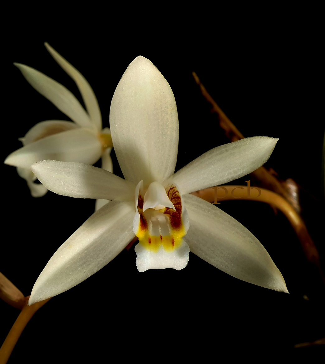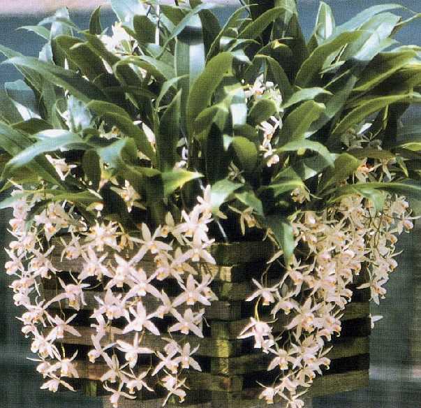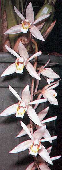 Found in Nepal, northern India, Bhutan, Sikkim, Myanmar, Laos and southern China at elevations of 900 to 2000 meters in rain forests, lower and upper montane forests as a very rewarding, medium sized, warm to cool growing species with close set, conical, lightly grooved pseudobulbs carrying 2 apical, lanceolate, acuminate, plicate, 3 nerved, gradually narrowing below into the elongate, grooved, petiolate base leaves. It produces basal, slender, pendulous 10" [25 cm] long, somewhat fractiflex rachis, loosely few to many [5 to 12] flowered, racemose inflorescence arising on a mature pseudobulb with deciduous floral bracts and waxy, highly perfumed [not so good], cream coloured, simultaneously opening flowers, each reaching about 2" [4-5 cm] across, occuring in the summer.