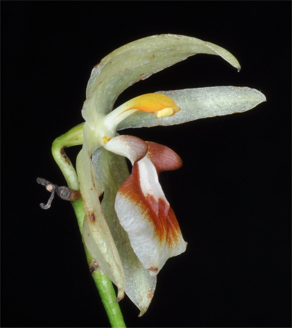 Found in the Lesser Sunda Islands on Flores island in lower montane forests at elevations around 1200 meters as a small sized, cool growing epiphyte with ovoid, rugose pseudobulbs carrying 2 apical, lanceolate, acute, coriaceous, 5 to 7 nerved, narrowing below into the petiolate base leaves that blooms in the summer arising on a newly developing pseudobulb, 3.2 to 4" [8 to 10 cm] long, overall, zig-zag, simultaneosuly 2 to 3 flowered inflorescence.
