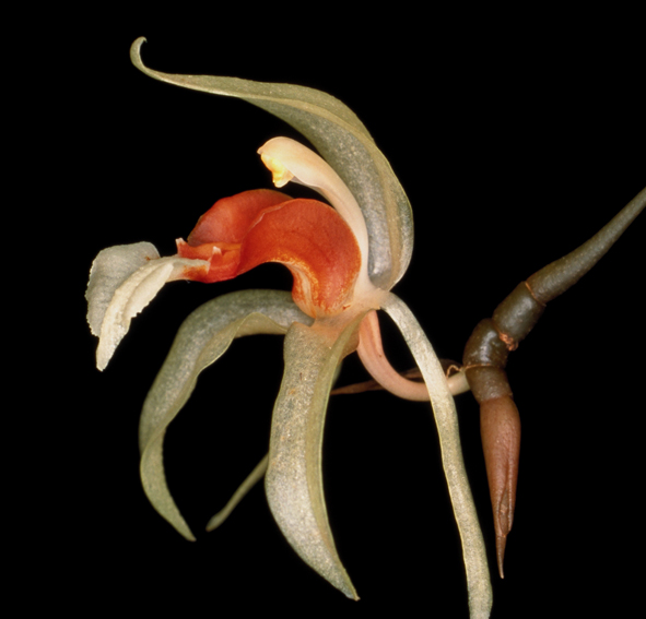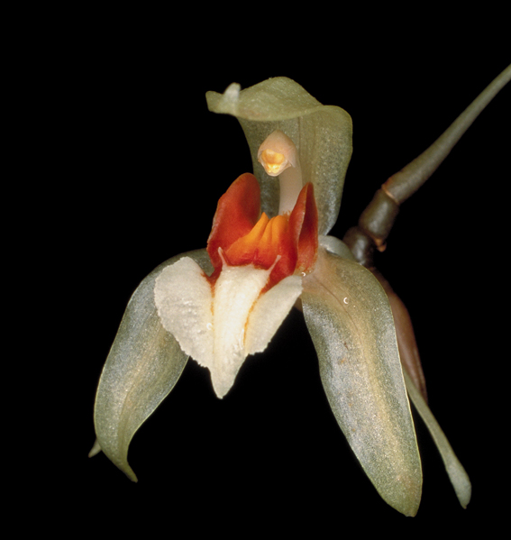 Found in all of Borneo in hill and lower montane forests at elevations of 600 to 1600 meters as a just medium sized, warm to cool growing epiphyte with close set, erect, elongated, fleshy, green, ellipsoid, narrowing towards the apex and the base pseudobulbs carrying a single, apical, lanceolate, acuminate, plicate, 6 to 7 nerved, finely coriaceous, gradually narrowing below into the petiolate base leaf that blooms in the spring and fall on a erect, slender 3.2 to 4" [8 to 10 cm] long, fractiflex rachis, to 12 flowered inflorescence arising on a newly emerging growth with large flowers that open in succession.