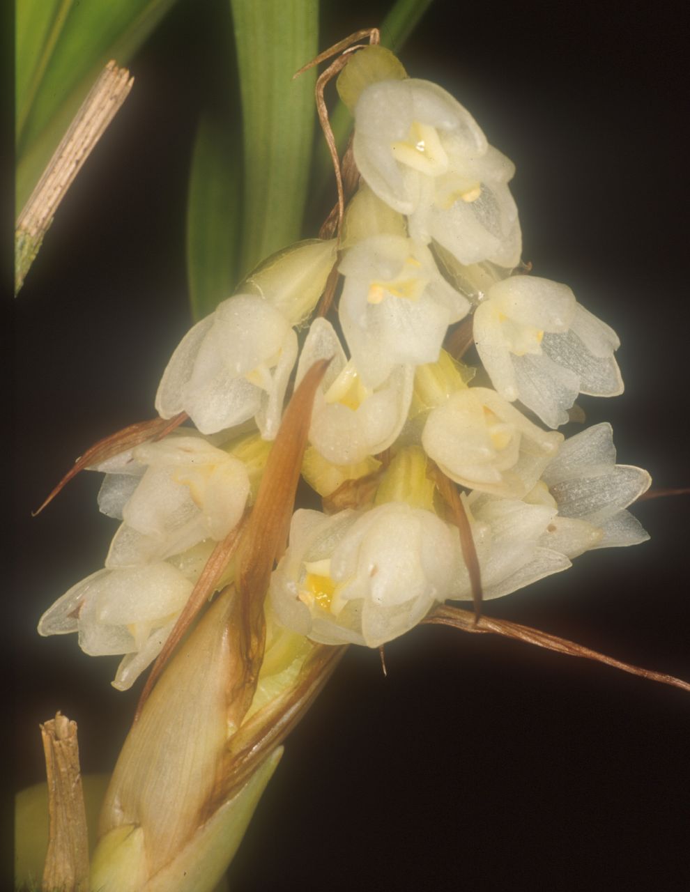 Found in Mexico, Guatemala, Cuba, Jamaica and Puerto Rica at 500 to 1400 meters in pine-oak, liquambar forests and montane rainforests as a a medium sized, warm to cool growing epiphyte or lithophytic herb with clustered, ovoid to ellipsoid, olive green pseudobulbs carrying up to 5 apical, subplicate, coriaceous, linear-elliptic, acuminate leaves that occurs that blooms in the late winter and spring with a lax or crowded, basal, 4 to 10" [10 to 26 cm] long, bracteate raceme arising on a mature pseudobulb carrying very fragrant flowers that do not open well, found high in trees along streams, and becoming very dense masses of plants.