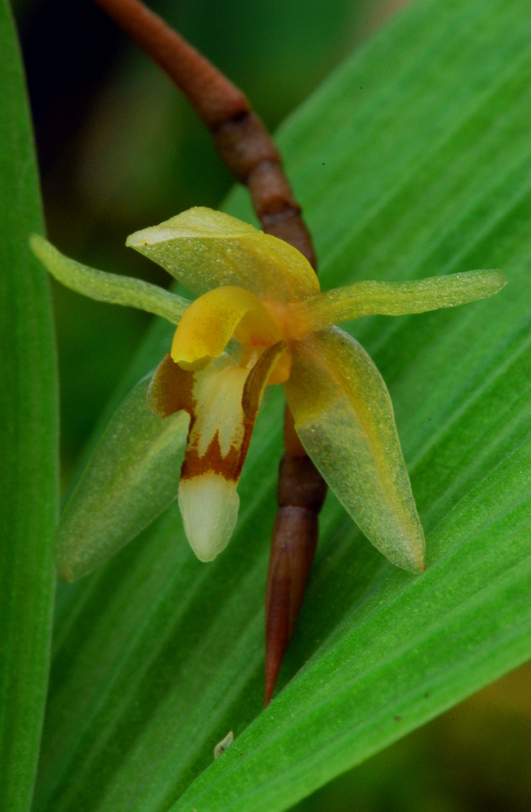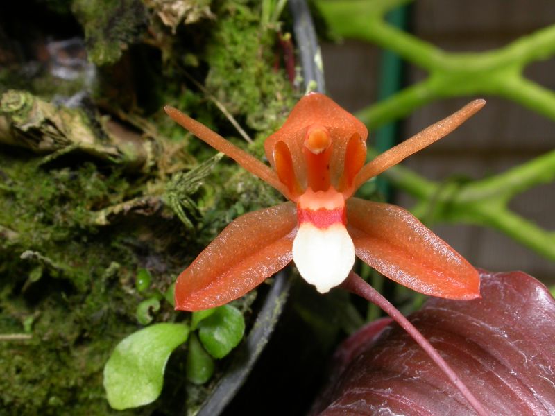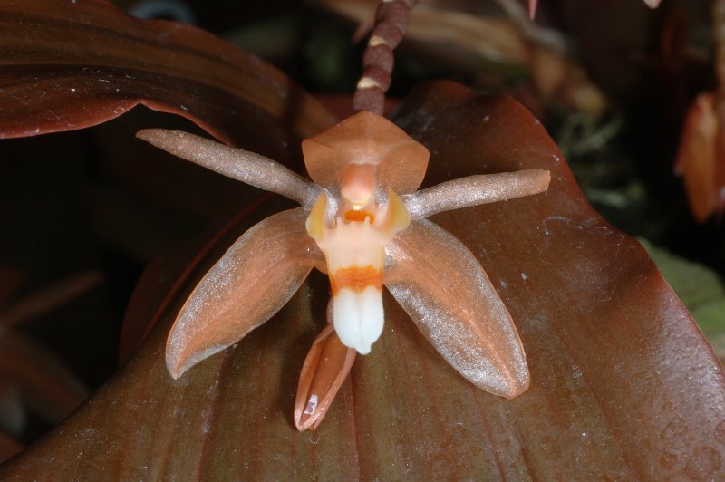 Found in Java, Sumatra and Borneo in lowlands and lower montane, mossy forests at elevations of sea level to 1200 meters as a small sized, hot to cool growing epiphyte with smooth, obtuse-angled, gradually narrowing above to the apex pseudobulbs and carrying a single, apical, erect, copper to green, oblong-elliptic, sharply acuminate, abruptly contracted below into the petiolate base leaf that blooms on a erect then pendulous, 6.4 to 7" [16 to 17.5 cm] long, dull brown, thickened rachis, few to several successively flowered inflorescence arising on a mature pseudobulb.