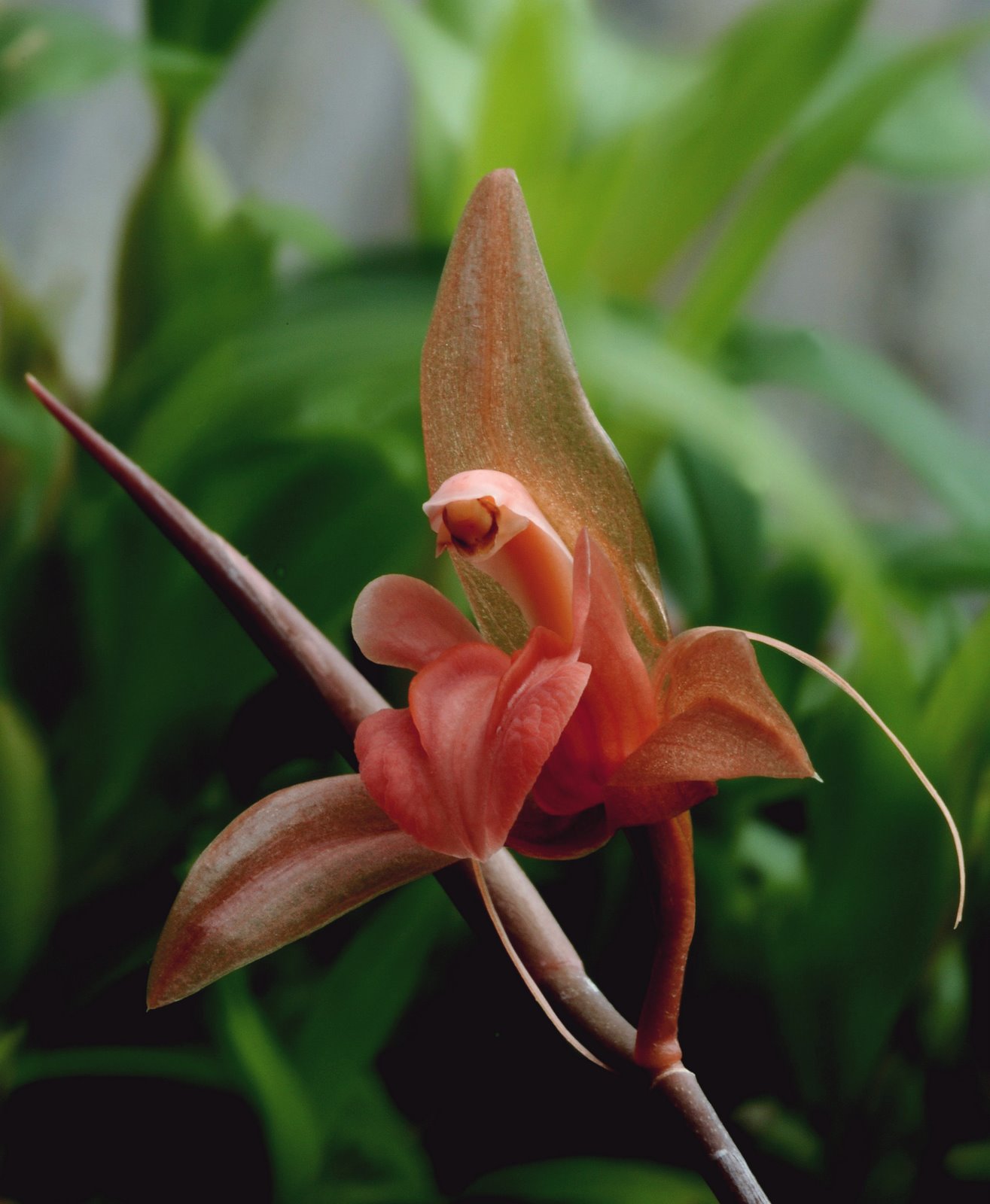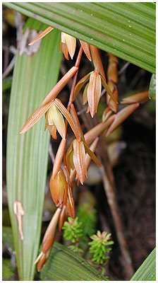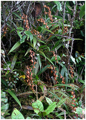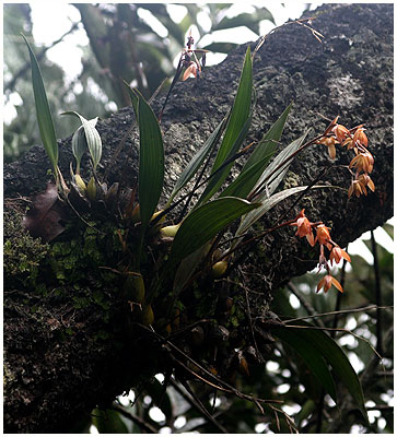 Found in Sabah Borneo on Mt Kinabalu, in lower montane, oak laurel forests at elevations of 900 to 2000 meters as a medium sized, warm to cool growing epiphyte with very nearly cylindric, stem-like pseudobulbs enveloped basally by large sheaths and carrying 2 apical, narrowly elliptic, sharply acuminate, coriaceous, plicate, 5 to 9 nerved, narrowing below into the indistinct petiolate base leaf that blooms in the fall on a hysteranthous, rigid, erect, 10" [25 cm] long, fractiflex, successsively to 36 flowered inflorescence with deciduous floral bracts.