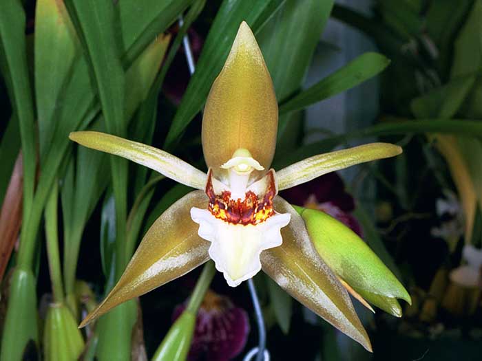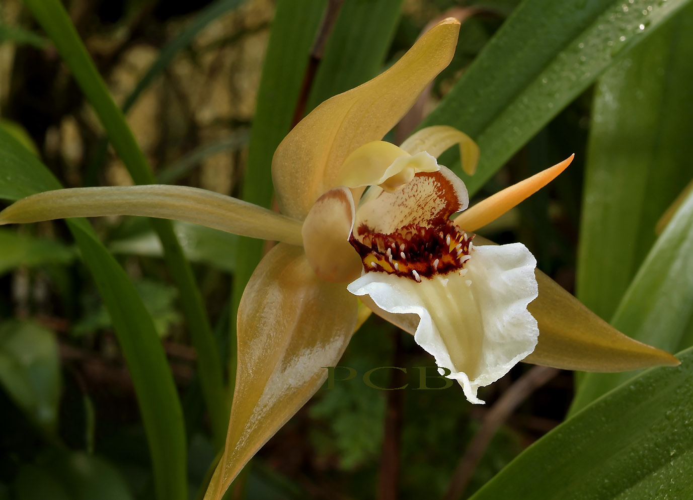 This is a medium sized, cool to warm growing, epiphytic species that is found in the Himalayas and Vietnam in primary montane forests at moderate elevations with ovoid-oblong pseudobulbs carrying 2, lanceolate, broad, plicate, 8 nerved, acuminate, gradually narrowing below into the elongate, openly grooved petiolate base leaves that blooms in the fall through spring on a 10" [25 cm] long, arching, terminal scape arising on a mature pseudobulb with waxy, fragrant sweet floral scented , long-lasting, solitary successive opening flowers [up to 6] held just above the leaves.