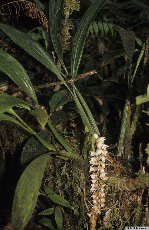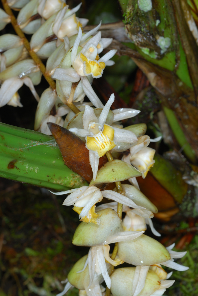 Found in Sabah, Borneo in lower montane mossy forests at elevations of 1100 to 2400 meters as a giant sized, cool to cold growing epiphyte, lithophyte or terrestrial with close set, slender, cylindrical, longitudinally grooved, elongate pseudobulbs carrying 2, linear to very narrowly elliptic, plicate, 7 to 9 nerved, gradually narrowing below into the petiolate base leaves that blooms in the spring and fall on a synanthous, limply pendulous, straight to slightly fractiflex, 12 to 36" [90 cm] long, 24 to 65 flowered inflorescence arising on a newly appearing growth and has simultaneously opening flowers and ovate to broadly ovate, persistent floral bracts.