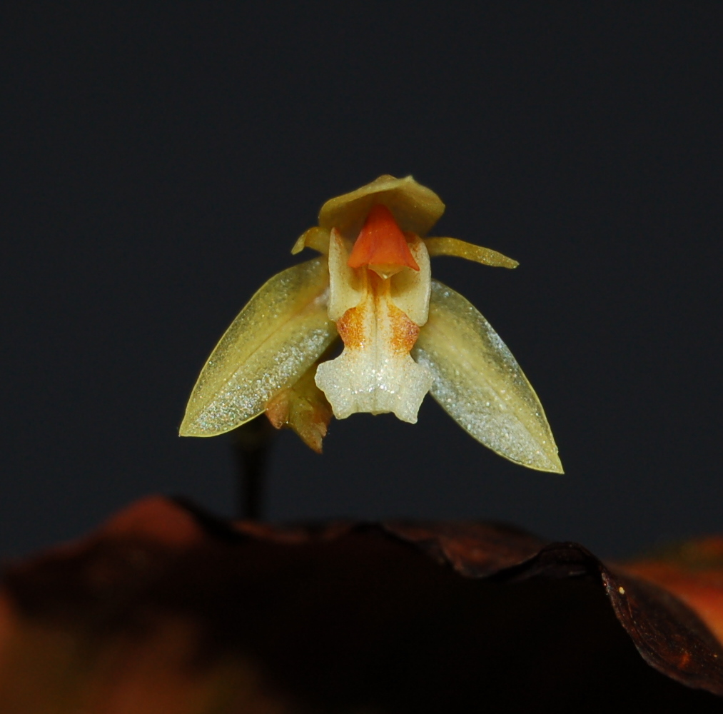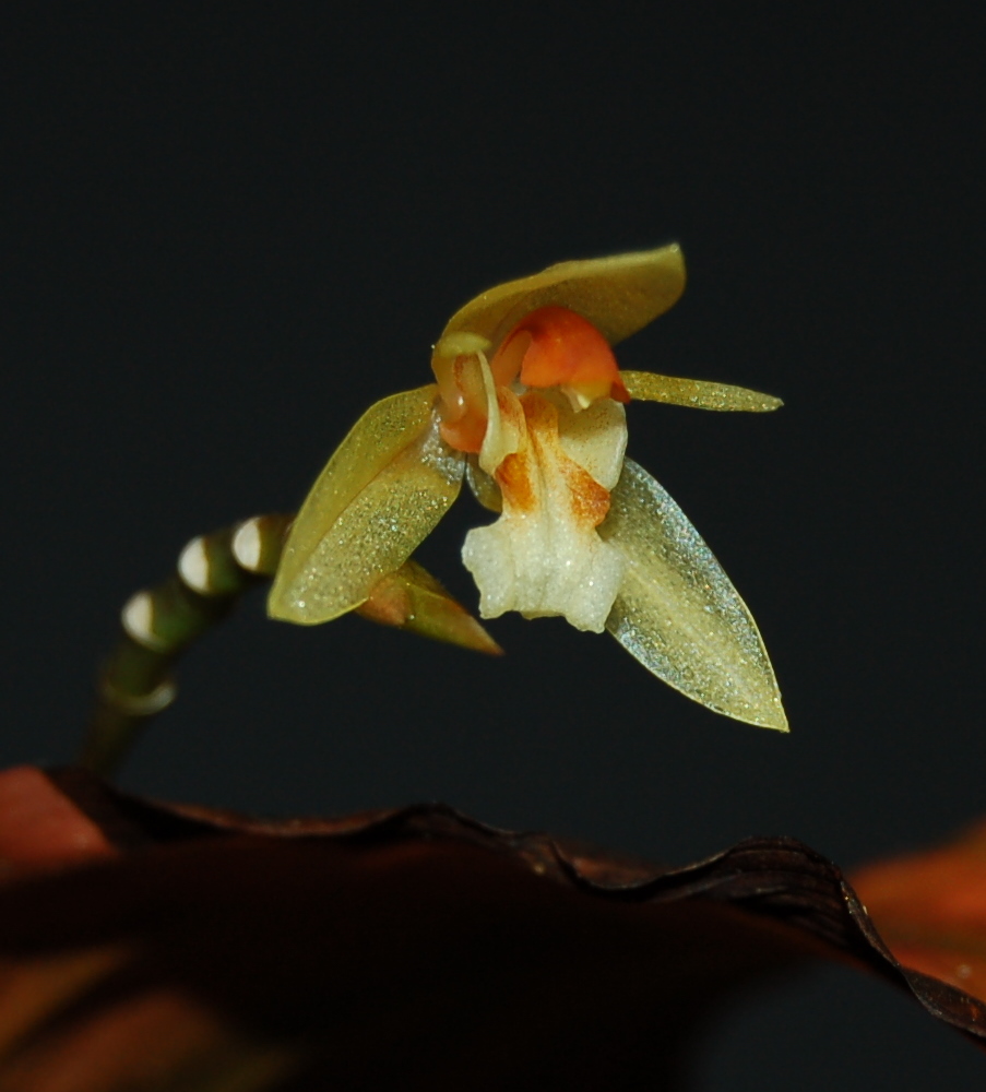 Found in Kalimantan Borneo in lower montane forests at elevations of 600 to 1500 meters as a small sized, warm to cool growing epiphyte with a short, creeping rhizome giving rise to close set, slender, elongate pseudobulbs carrying a single, apical, erect, plicate, oblong-elliptic, acute-acuminate, 7 nerved, narrowing below into the to 4" [10 cm] long, grooved, petiolate base leaf that blooms in the late winter and early summer on a hysteranthous, thread-like, gradually thickening towards the apex, zig-zag, to 6.8" [17 cm] long, successively single flowered inflorescence