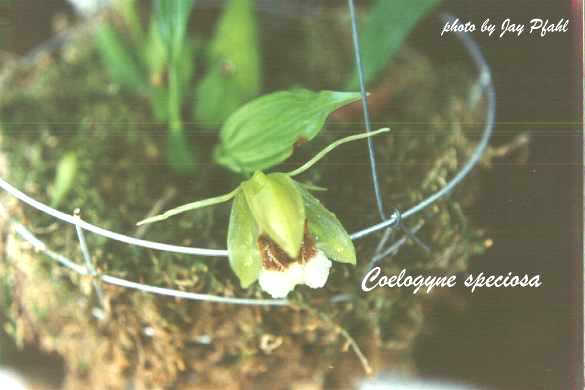 This large sized, warm to cool growing epiphyte and occasional terrestrial occurs in rainforests at elevations of 700 to 2000 meters has clustered ovoid pseudobulbs carrying a single to 2, apical, elliptic or lanceolate, acute petiolate, plicate leaves and blooms on a terminal, erect to nodding, 3" [7.5 cm] long, 1 to 3 flowered, racemose inflorescence with musky scented flowers which arise out of the center of a newly arising pseudobulb growth and can bloom at any time of the year but most often in spring and summer. It has a strange flying insect appearance, grows best in baskets with semi shade and is from Malaysia, Borneo, Java and Sumatra.