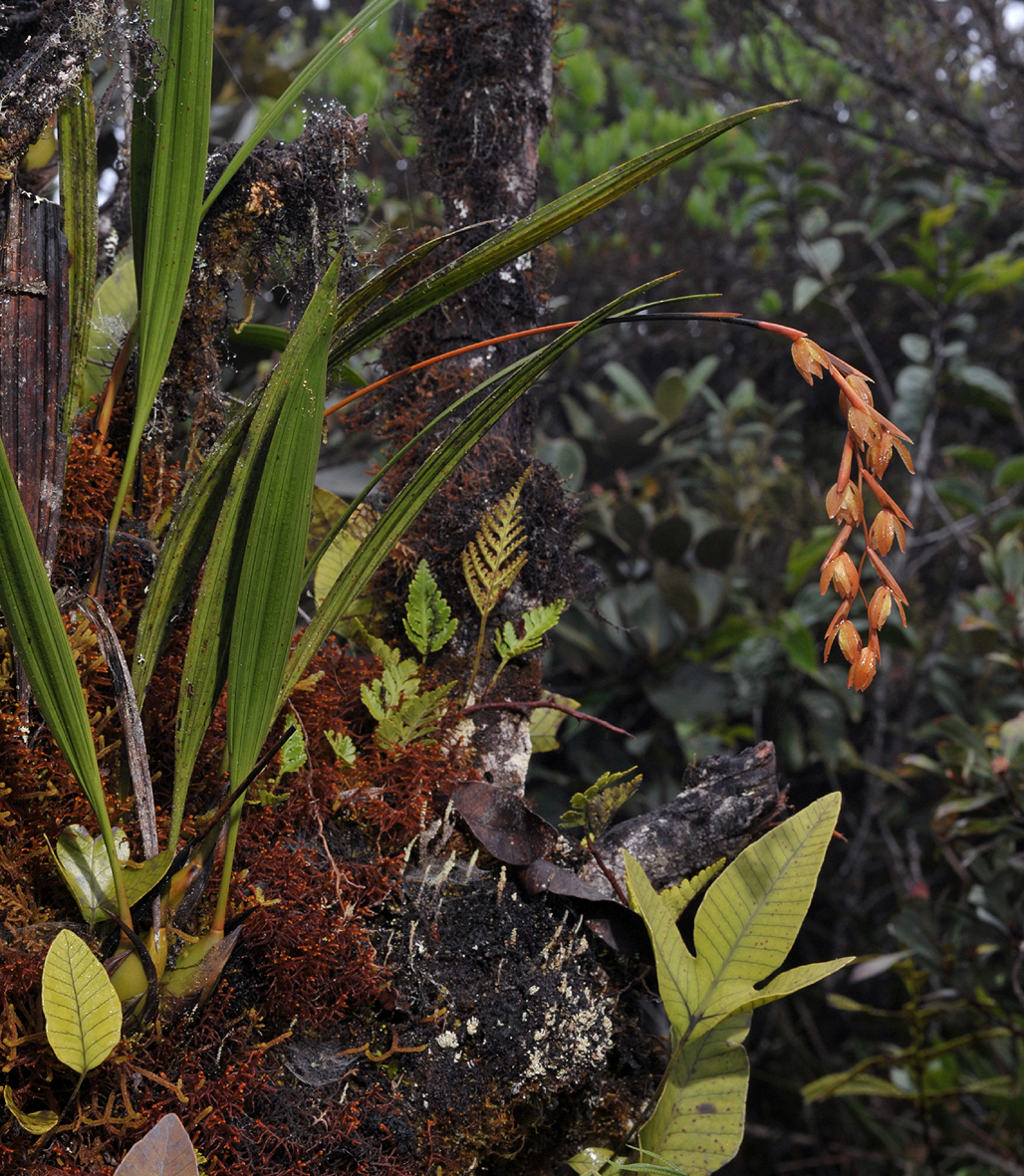Found on the lower slopes of Mount Kinabalu, in Sabah and Sarawak, often in high montane forests at elevations of 1200 to 3400 meters as a small sized, cool to cold growing epiphyte with fusiform-cylindric to broadly pyriform pseudobulbs enveloped basally by a few sheaths and carrying a single, apical, linear, oblong-linear or oblong-elliptic, strongly plicate, rigid, erect, coriaceous, gradually narrowing below into the cylindrical, petiolate base leaf that blooms in the late spring and early summer on a sub-erect to arching, slightly fractiflex, 12" [30 cm] long, loosely few flowered inflorescence arising on a mature pseudobulb.