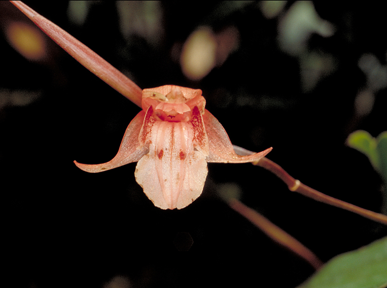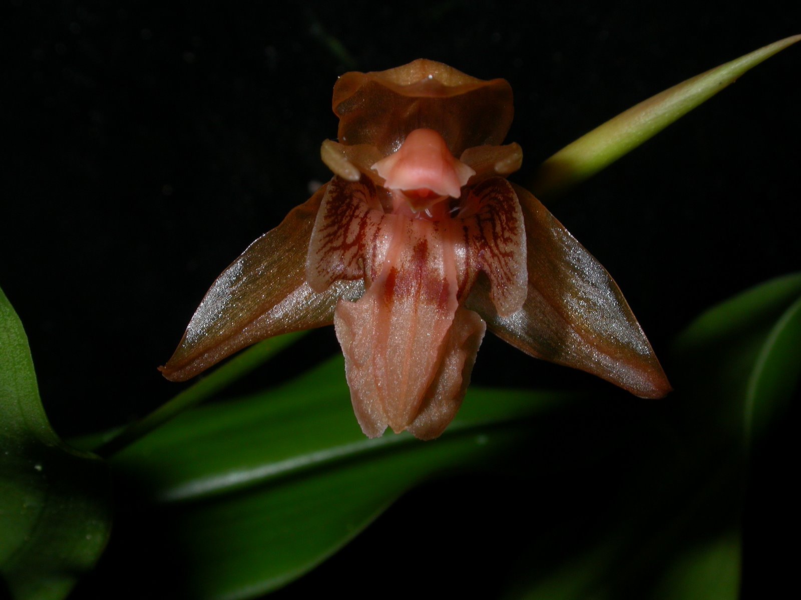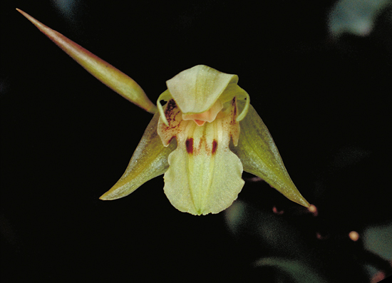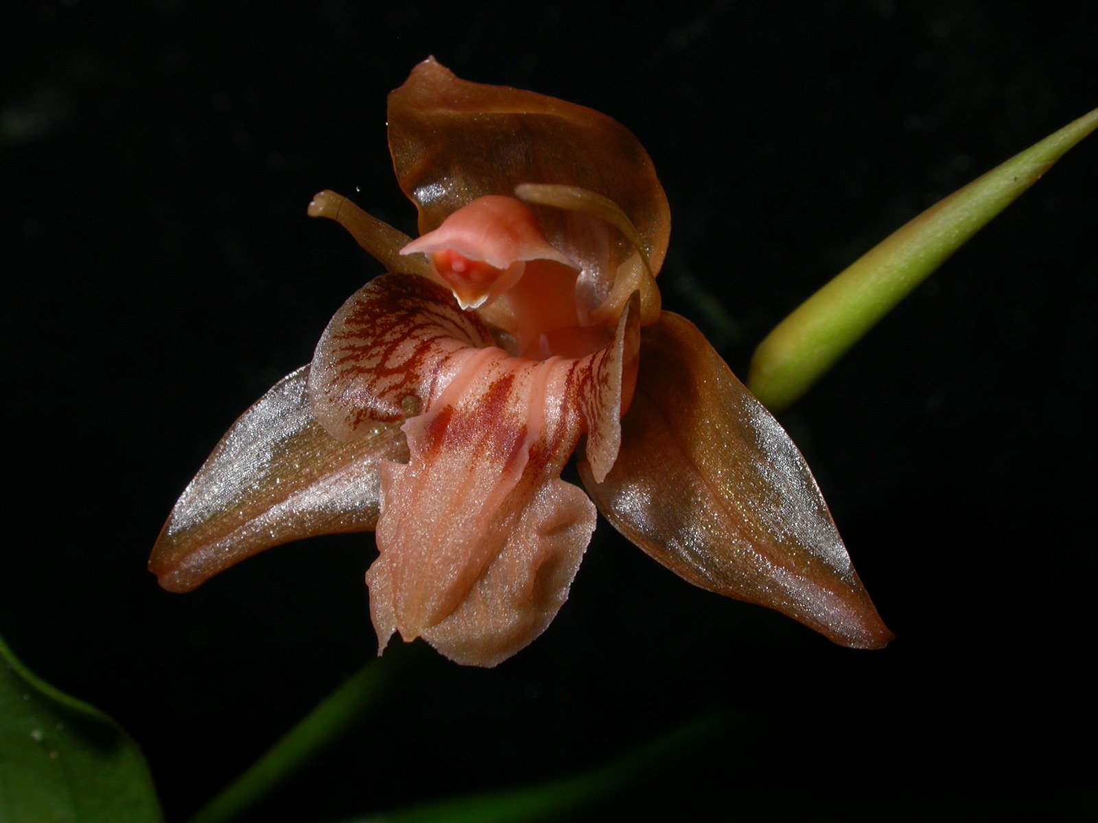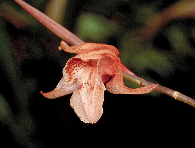 Found in Thailand, penninsular Malaysia and Borneo on mountain ridges and lower montane forests at elevations of 1000 to 1900 meters as a small sized, cool growing epiphyte or lithophyte with a swollen and somewhat flattened, basally slender, sulcate with age, pink, red to brown pseudobulb enveloped basally by loose sheaths and carrying 2, elliptic, acute, plicate, 9 nerved, gradually narrowing below into the elongate, petiolate base leaves that blooms in the later winter and early spring on an erect, flat, bare, 16.4" [42 cm] long, fractiflex rachis, 10 to 30 flowered inflorescence arising as a new growth emerges with deciduous floral bracts and carrying successively opening flowers.