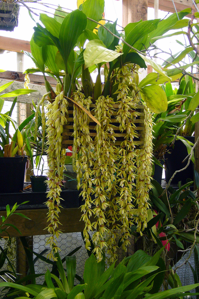 Found in Malaysia, Borneo, Java and Sumatra and east to the Philippines in lowlands often on trees overhanging rivers at elevations up to 1500 meters as a medium sized, hot to cool growing epiphyte and occasional lithophyte with 3.4 to 1.4" between each, cylindric, narrow, strongly furrowed pseudobulb carrying 2, oblanceolate to obovate, rounded and slightly acuminate, gradually narrowing below into the 2" [5 cm] long, petiolate base leaves and blooms in the winter in Singapore cultivation on a basal, heteranthous, to more than 1 1/2' [45 cm] long, pendant, racemose inflorescence arising on a mature pseudobulb with brown basal bracts with up to 40 fragrant, lemon-scented, simultaneously opening flowers. The flowers semi-close each night and reopen in the morning with the sun's arrival.