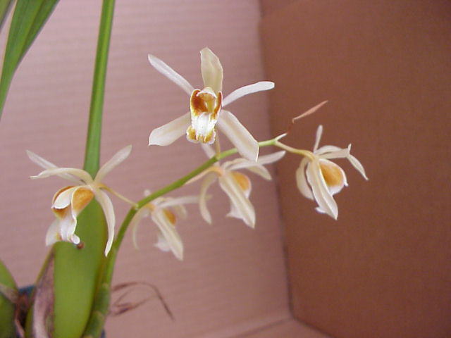 Found in Burma as a medium sized, warm to cool growing epiphyte with ovoid, pseudobulbs carrying 2, linear leaves that blooms in the fall on a loosely 3 to 5 flowered, 4" [10 cm] long, bracteate inflorescence with fragrant flowers arising from the apex of a new growth.