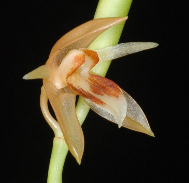 Found on Mindanao island within the Philippines at elevations of 800 to 1000 meters as a small to medium sized, warm growing epiphyte with tapered pseudobulbs with persistent sheaths and carrying 2, elliptic to lanceolate, leathery, narrowing below intothe grooved petiolate base leaves that blooms in the fall on an erect, arising with the leaves, flattened, to 10" [25 cm] long, rachis zig-zag, successively single, several flowered inflorescence