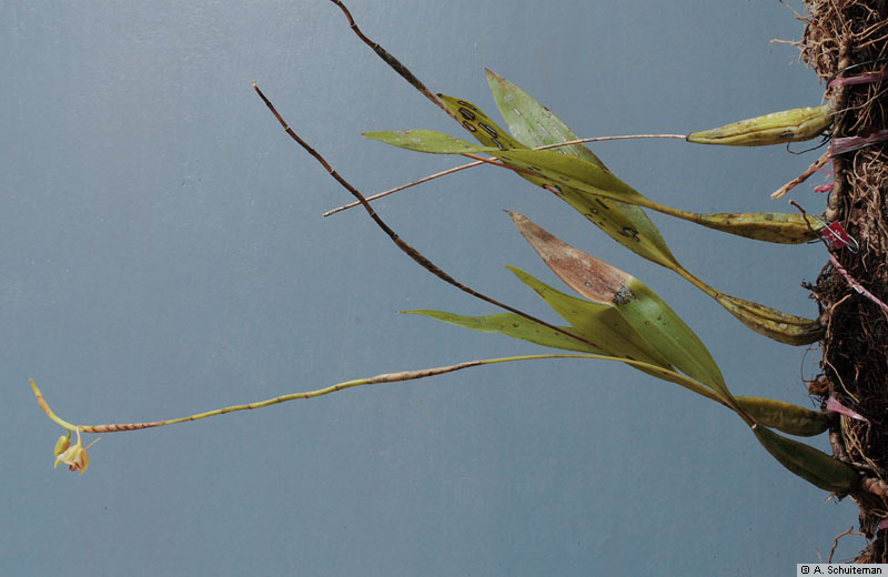 Found in Assam, eastern Himalayas, Nepal, Bhutan, Sikkim, Myanmar, Thailand, Laos, south China and Vietnam in evergreen and semideciduous cloud forests on open rocks and on tree bases as a miniature to small sized, warm to cool growing epiphyte or lithophyte at elevations of 500 to 2000 meters with a stout creeping rhizome giving rise to ovoid to ellipsoid, irregularly ridged and furrowed, green pseudobulbs with basal sheathing and carrying 2, apical, oblong to elliptic-lanceolate, acute to acuminate, 7 veined, plicate leaves that blooms in the spring on a hysteranthous, erect to curved, 4 to 9 flowered, green to greenish brown, 2 to 10" [5 to 25 cm] long, racemose, weakly fractiflex inflorescence with overlapping glume-like sheaths.