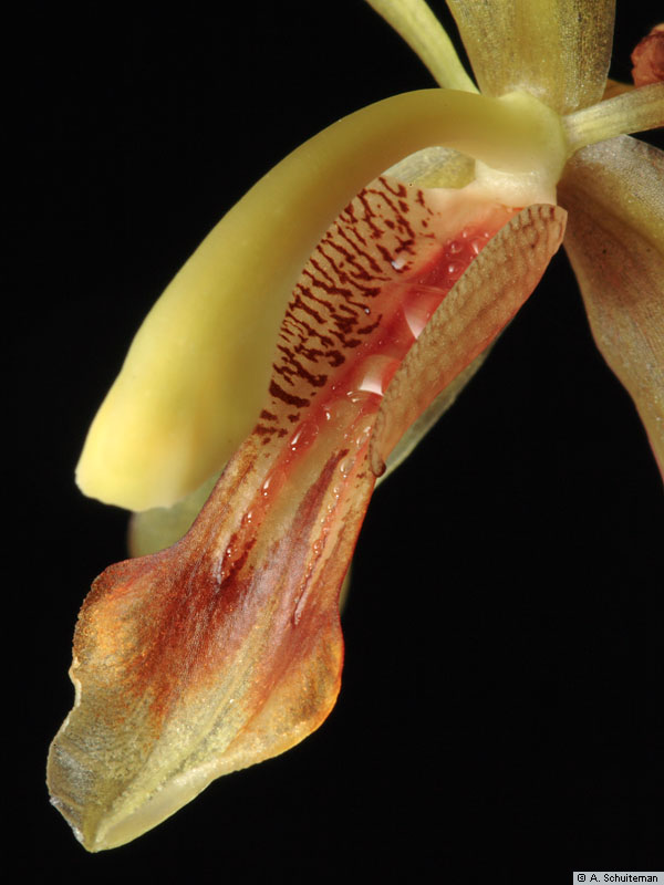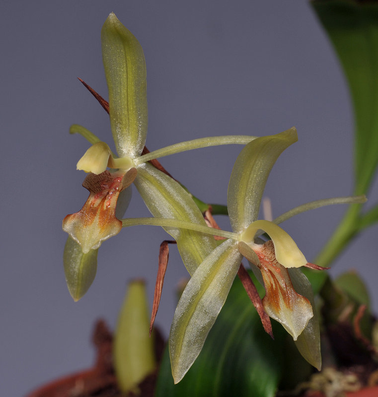 Found in Laos as a miniature sized, warm to cool growing epiphyte with ovoid to fusiform, rugose with age pseudobulb carrying 2, apical, erect, elliptic-oblong, acuminate, attneuate below into a short petiolate base leaves that blooms in the fall on an erect to arching, arising terminally on a mature pseudobulb, peduncle to 2.8" [7 cm] long, [14.5 cm] long overall, zig-zag, simultaneously 2 to 3 flowered inflorescence