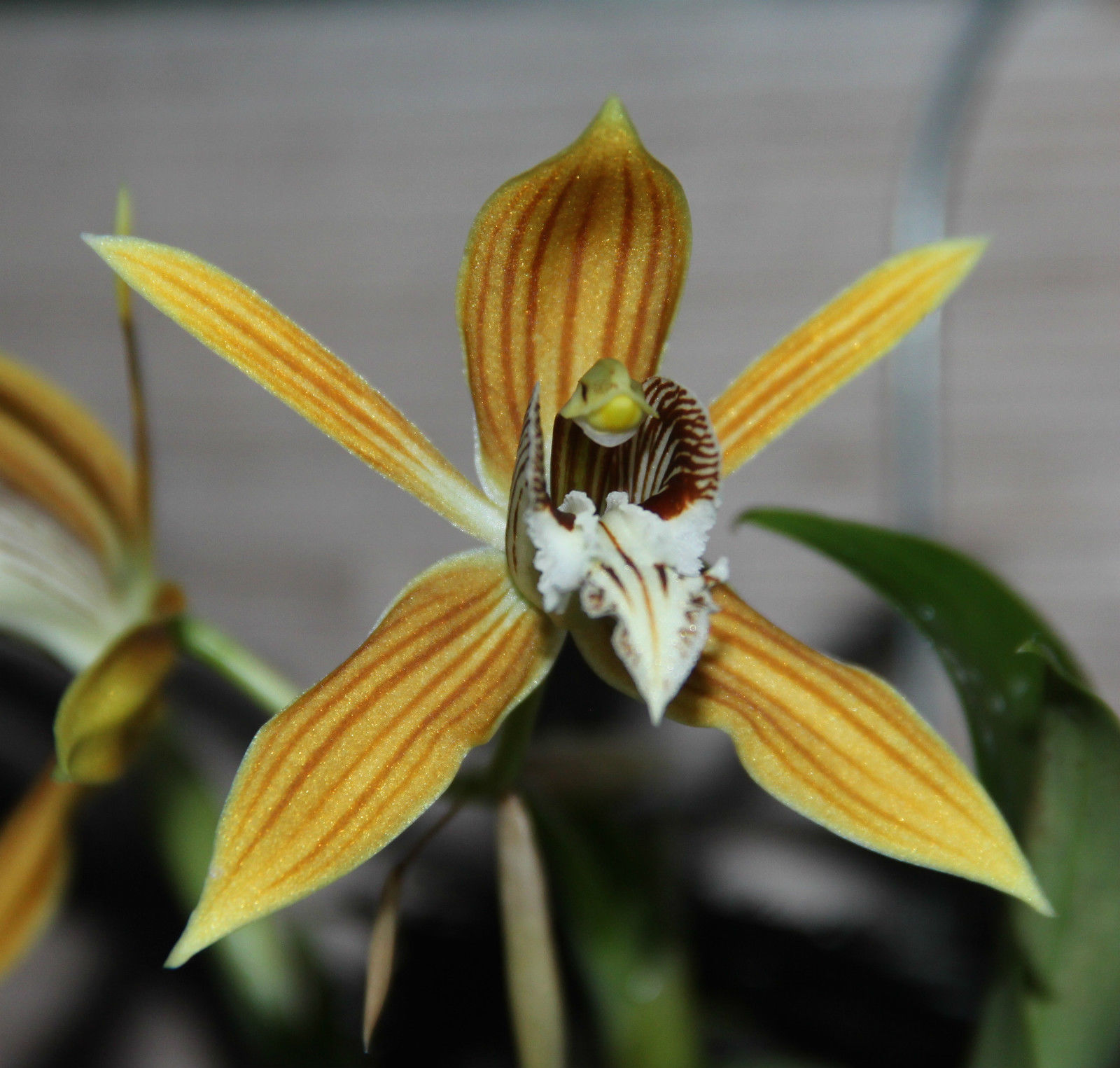 Found in western Yunnan Province of China on trees in subtropical, montane evergreen forests, at elevations of 2400 to 3500 meters as a small sized, cold growing epiphyte with close set, longitudinally wrinkled, basally rounded, conic to cylindric, carrying 2, linear-lanceolate, 7+ veined, acute to obtuse, narrowing below into the indistinct petiolate base leaves that blooms in the late spring and early summer on a synanthous to proteranthous, peduncle to 2.8" [7 cm] long, rachis to 4" [10 cm] long, 1 to 3, successively single flowered inflorescence enveloped below by 3 to 4 straw colored sheaths and has deciduous floral bracts.
