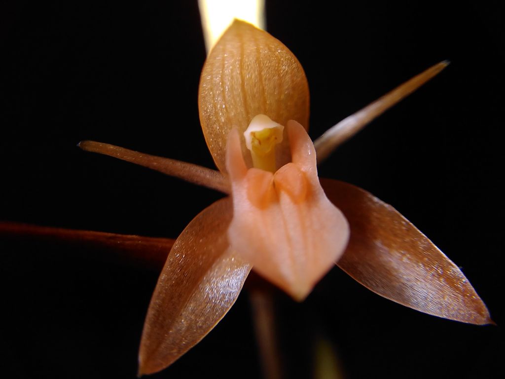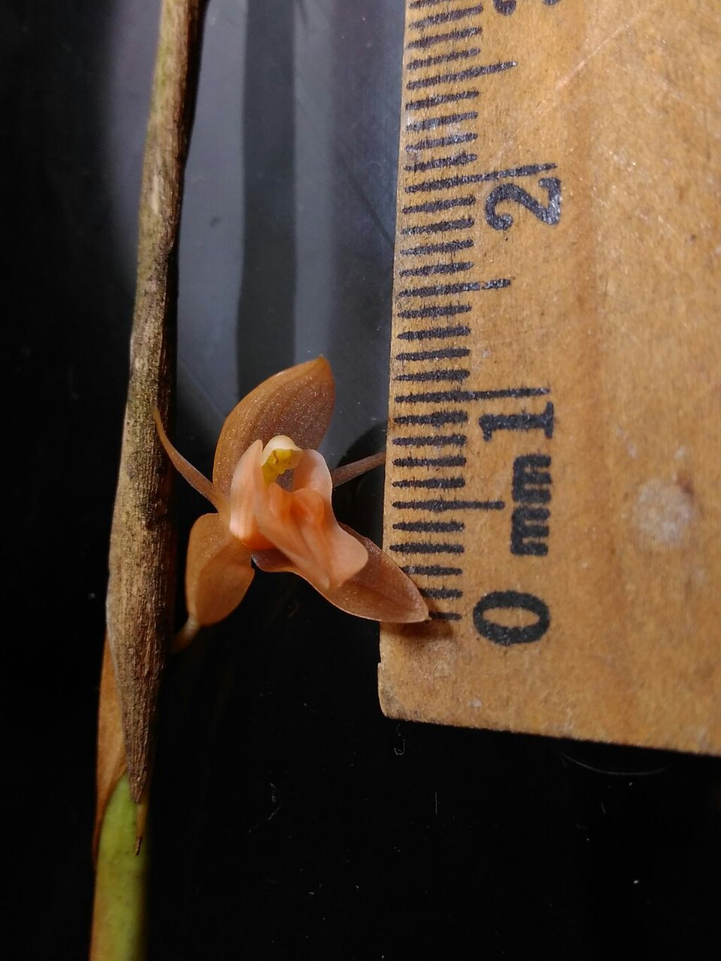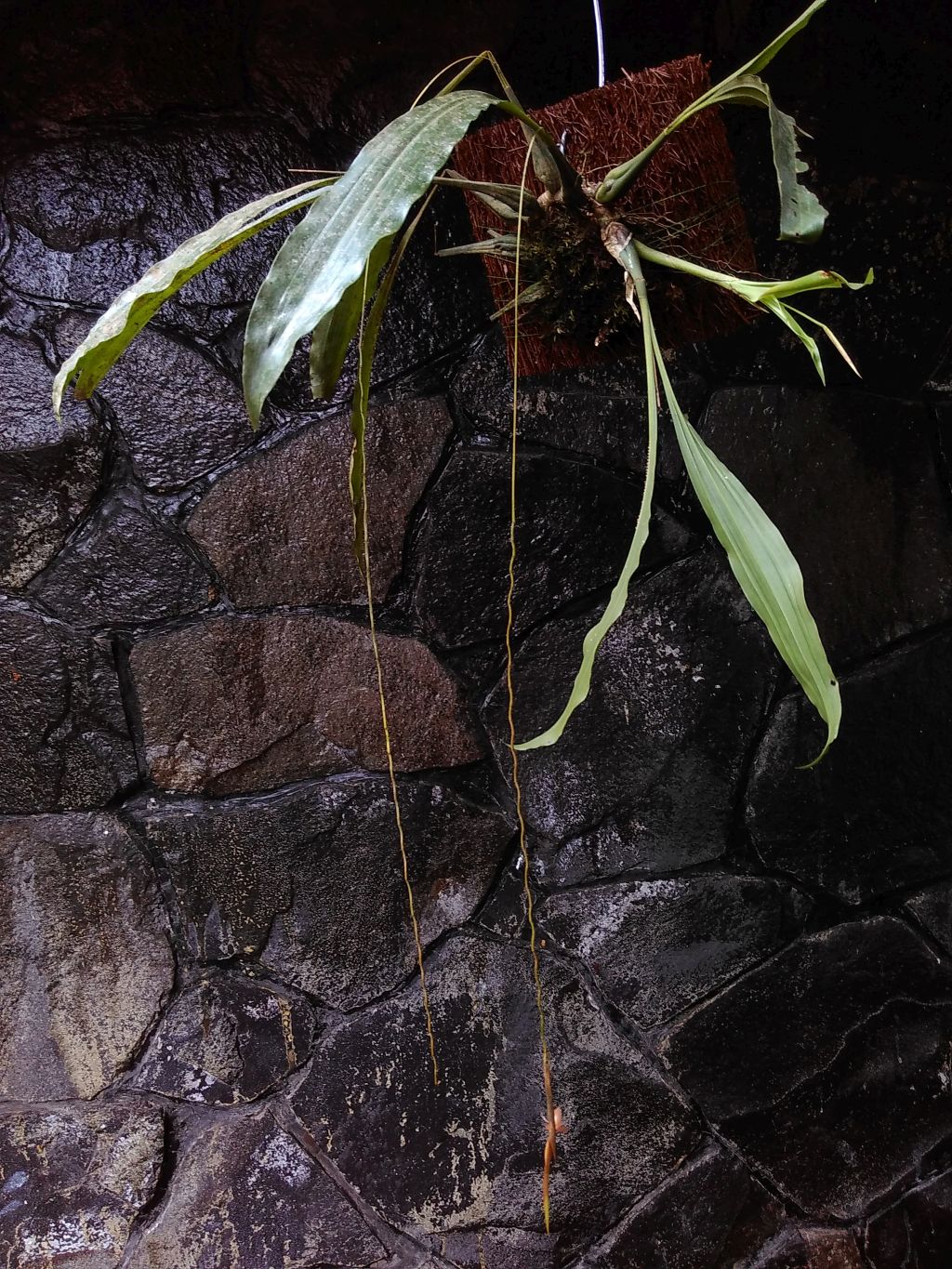 Found in southwestern Java in lower montane forests at eleavtions of 1000 to 1500 meters as a medium sized, cool growing epiphyte with 1.2" [3 cm] between each 4 angled, narrowing towards the apex pseudobulb carrying 2, narrowly lanceolate, acute, 5 prominent veined beneath, grasually narrowing below into the petiolate base leaves that blooms on an erect, arising on a mature pseudobulb, terminal, peduncle to 10" [25 cm] long, to 20" [50 cm] long, to 36 flowered inflorescence.