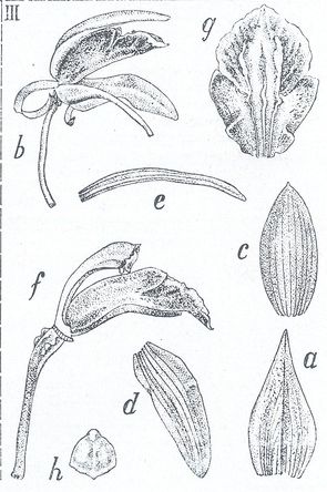 Found in the Moluccas on the island of Buru as a small sized, warm to cool epiphyte with close set, elongated pseudobulbs carrying 2, lanceoalte, gradually narrowing from the base to the apex, acute, 5 nerved, firm paper-like texture, widening below into the grooved, petiolate base leaves taht blooms in the spring on synanthous, peduncle bare, 1.8" [4.5 cm] long, rachis zig-zag, to 3.4" [9 cm] long, to 6 flowered inflorescence