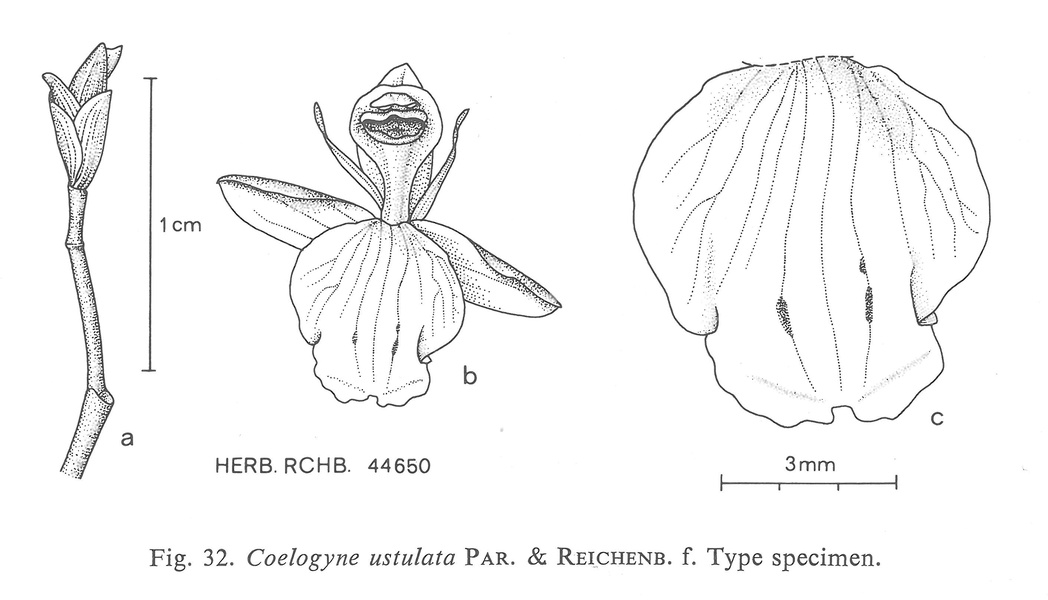 Coelogyne ustulata Parish & Rchb. f. 1874 SECTION Proliferae Lindley Drawing by Seidenfaden and The Swiss Orchid Foundation a the Jany Renz Herbaria Website.