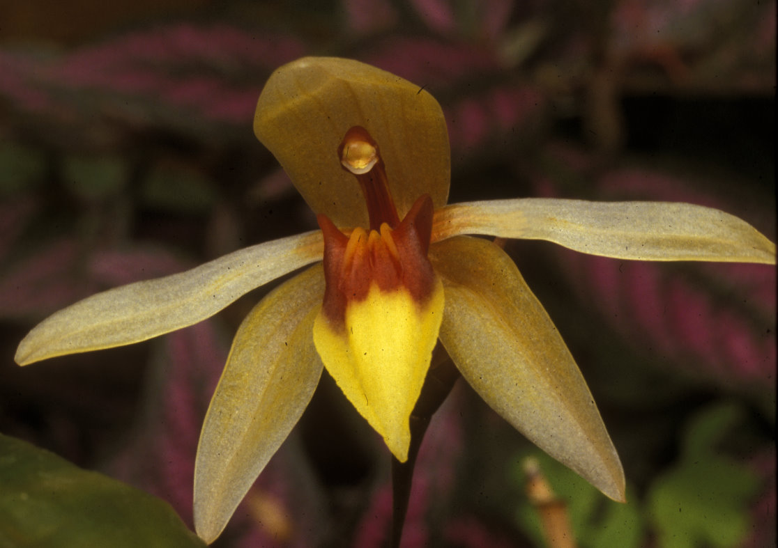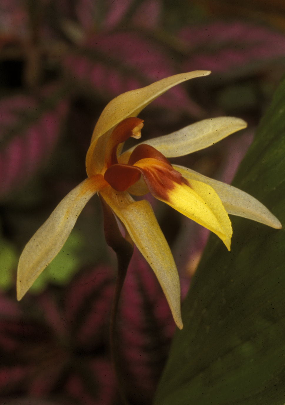 Found in Sumatra and Borneo in lower montane forests at elevations around 1400 meters as a large sized, cool growing epiphyte with short branching rhizomes giving rise to a rhomboid, obtuse angled, narrowing towards the apex pseduobulb carrying a single, apical, curved, oblong, acuminate, acute, undulate margins, plicate, dull green, tinged with brown, gradually narrowing below into the petiolate base leaf that blooms in the late spriung through fall on a hysteranthous, dull brown, thin, tapering towards the apex, to 11" [to 27.5 cm] long, rhachis slightly thickened, many flowered inflorescence carrying successive flowers.