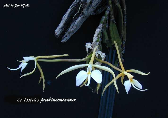 References W3 Tropicos, Kew Monocot list , IPNI ; The Orchids of Mexico and Guatemala Bateman 1843 as Epidendrum aloifolium drawing fide; Atlas des Orchidees Cultivees Constantin 1920 as E falcatum drawing fide; The Genus Epidendrum Ames 1936; Ceiba Vol 5 No 1 L O Williams; Ceiba Vol 5 No 1 L O Williams 1956 as Epidendrum parkinsonianum var falcatum; AOS Bulletion Vol 33 #3 1964 photo fide; Encyclopedia of Cultivated Orchids Hawkes 1965 ; AOS Bulletin Vol 36 #1 1967 photo fide; AOS Bulletin Vol 36 #4 1967; Las Orquedias De El Salvador Vol 1 Hamer 1974 drawing/photo fide; Die Orchideen 3 Auflage Bd 1 Sonderabdruck aus Schlechter Lieferung 9 513 - 576 Brieger, Maatsch and Senghas 1977 as Auliza parkinsonianum; Orquideologia Vol 12 No 3/4 1977/8 photo fide; Orquídea (Mexico City), n.s., 7[3]: 1979; Las Orquedias de El Salvador Vol 3 Hamer 1981 drawing fide; Flora Novo-Galaciana Vol 16 McVaugh 1985; AOS Bulletin Vol 56 No 3 1987 photo fide; Icones Orchidacearum I Plate 37 Hagsater and Salazar 1990 drawing fide; Orchids Travel By Air A Pictoral Safari Mulder, Mulder-Roelfsema and Schuiteman 1990 photo fide; Vanishing Beauty, Native Costa Rican Orchids Vol 1 Pupulin 2005 photo fide; Icones Planetarum Tropicarum plate 727 Dodson 1982 drawing fide; An Introdution to the Orchids of Mexico Wiard 1987 photo fide; Icones Orchidacearum 1 Plate 31 Hagsater & Sanchez 1990 see recognition section; A Guide to Orchids of the World Hodgson, Paine and Anderson 1991 photo fide; The Illustrated Encyclopedia of Orchids Pridgeon 1992 photo fide; Field Guide to the Orchids of Costa Rica and Panama Dressler 1993 photo fide; Icones Planetarum Tropicarum plate 1528 Atwood 1993 drawing fide; Manual Of Orchids Stewart 1995 drawing fide; Rudolf Schlechter Die Orchideen Band 1C lieferung 42 - 43 pg 2626 - 2762 Brieger 2001; Orquideas del Estado de Morelos ORQUÍDEA (MÉX.) VOLUMEN 16 NÚMERO ÚNICO enero 2002 drawing/photo fide; Botanica's Orchids Laurel Glen 2002 aphoto fide; Manual de Plantas de Costa Rica Hammel, Grayum, Herrera and Zamora 2003; Australian Orchid Review Vol 69 No 4 2004 photo; AOS Bulletin Vol 73 #7 2004 parkinsonianum photo fide; *The Cattleyas and Their Relatives, the Debateable Epidendrum Withner and Harding 2004 as Coilostylis parkinsonianum photo fide; Flora's Orchids Nash & La Croix 2005 photo fide; Orchids of Mexico Hagsater, Soto, Salazar, Jimenez, Lopez and Dressler 2005 photo fide; Boletim CAOB No 72 2008 photo fide; AOS Bulletin Vol 78 #6 2009 photo fide; Icones Orchidacearum 13 Plate 1337 Hagsater & Santiago 2010 See recognition section; Icones Orchidacearum Part 13 Plate 1368 Hagsater 2010 see recognition section; AOS Bulletin Vol 80 #7 2011 photo fide; AOS Bulletin Vol 82 #10 2013 photo fide; Guia de Orquideas de Chiapas Carlos Rommel Beutelspacher Baigts 2013 photo fide; Algunas Orquideas de Mexico Tomo 1 Suarez 2013 photo fide; Icones Orchidacearum 15 [1] Plate 1529 Hagsater & Sanchez 2015 see recognition section; AOS Bulletin Vol 86 # 3 2017 photo fide; Lankesteriana 19(1). 31 - 55 2019 photo fide; Orchid Genera and Species in Guatemala Archila, Szlachchetko, Chiron, Lipinska, Mystkowska and Bertolini 2018