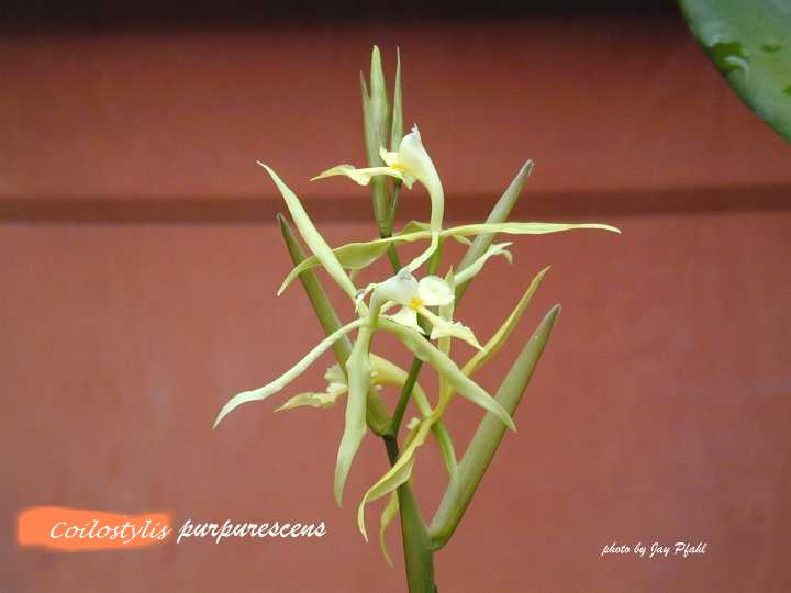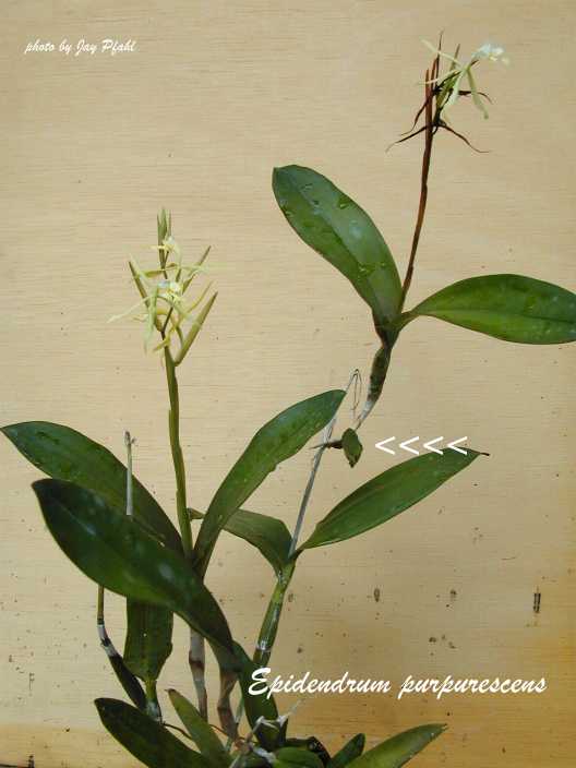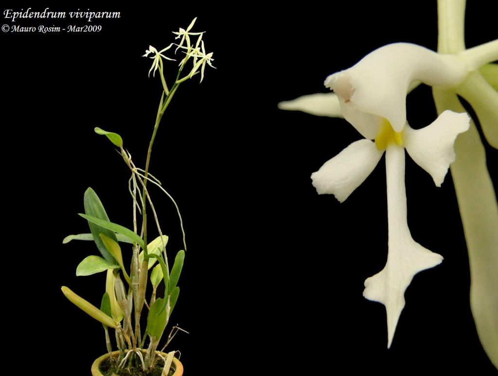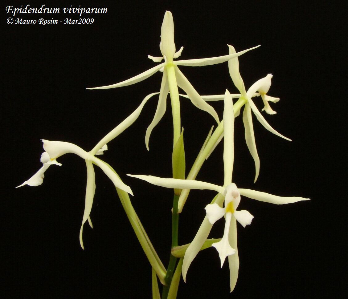 This plant is often misnamed as Epidendrum purpurascens Syn Coliostylis clavata but that species has compressed pseudobulbs with no keikis on the inflorescence, while E vivipara has cylindrical pseudobulbs and an inflorescence that has a tendency to grow small plantlets after flowering.