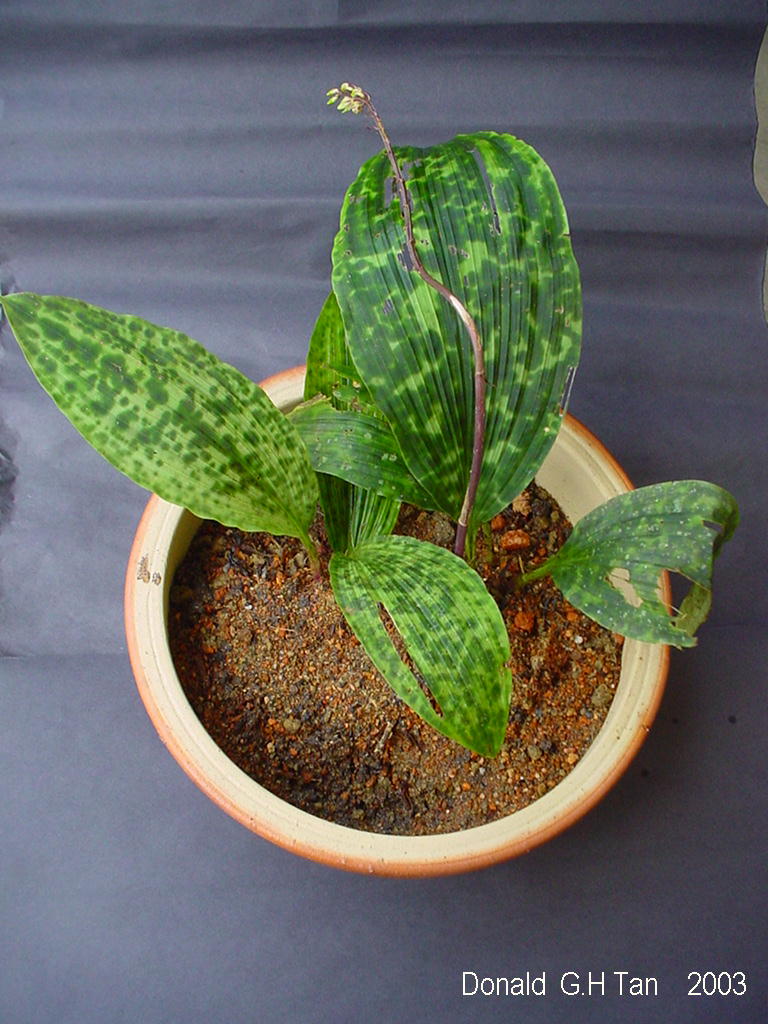 Found in penninsular Malaysia, Java, Borneo and Sumatra in hill and lower montane forests at elevations of 500 to 1900 meters as a small to medium sized, warm to cool growing terrestrial with a creeping rhizome giving rise to 1 to 3 somewhat quadrangular and apically narrowed pseudobulbs carrying a single, elliptic-oblong, shortly acuminate, purple in youth and then light sea-green with darker green blotches, marginally undulate, gradually narrowing below into the petiolate base leaves and then a cylindrical pseudobulb that carries a basal, 10 to 22" [25 to 55 cm] long, successively single, many flowered inflorescence with the flowers held at the apex and having, long-triangular floral bracts occuring in the summer.