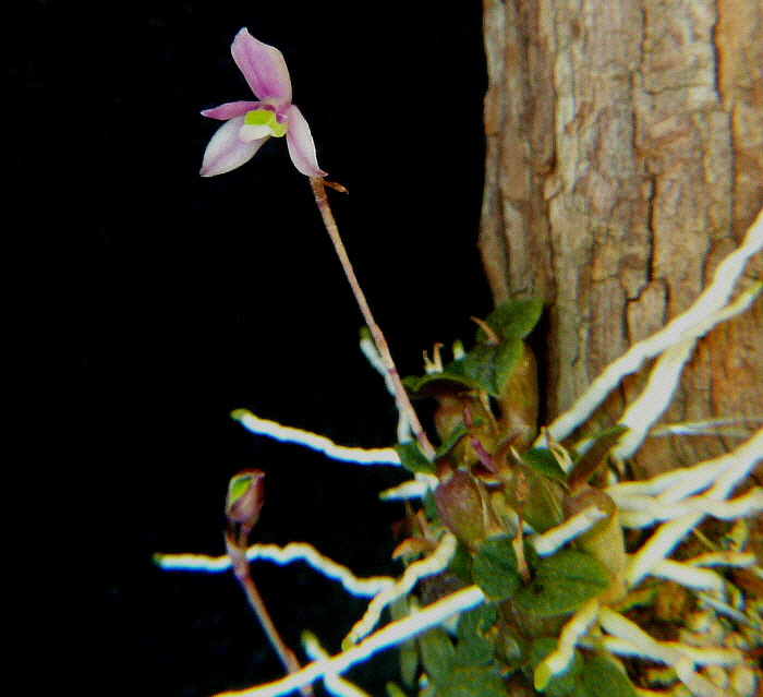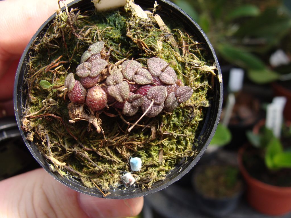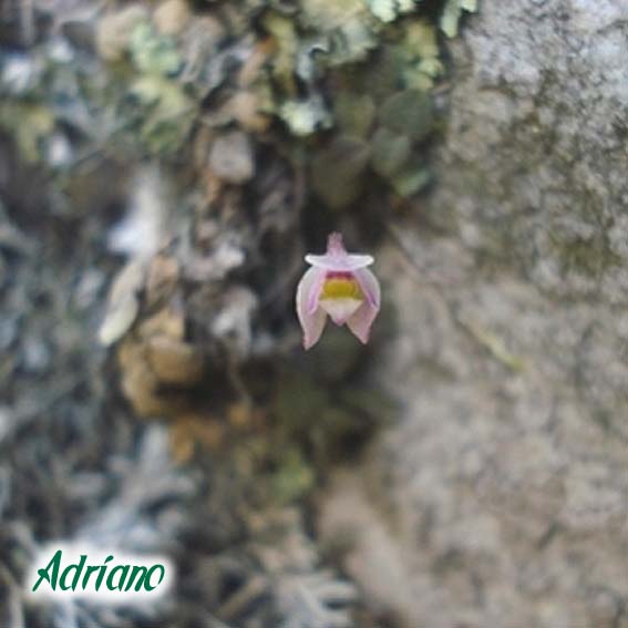 Found in Minas Gerais Brazil on large blocks of rock near Diamantina as a mini-miniature sized, cool growing lithophyte on vertical rock faces in deep shade with purple flushed, rounded but skewed off center pseudobulbs carrying 2 to rarely 3, apical, leathery, densely tuberculated, elliptic, convex, with a prominent midrib, distinct verrucosities above and rugosities beneath leaves that blooms in the fall on an erect, 1" [2.5 cm] long, single flowered inflorescence