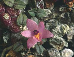 Found in northern Minas Gerais state of Brazil on shady, lichen covered, large vertical rock faces in very dry locations as a mini-miniature sized, cool growing lithophyte with roundish, slightly flattened diagonally, wrinkled with age pseudobulbs carrying 2, apical, asymetrical, ovate, acute, carinate, slightly tuberculed in crest-like lines, fleshy, basally somewhat cordate leaves that blooms in the fall on an erect, single flowered infloresecence