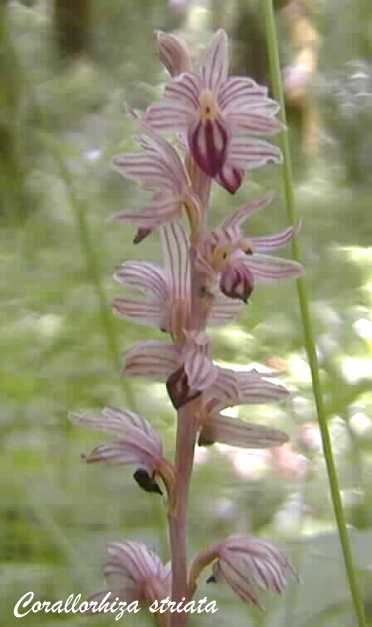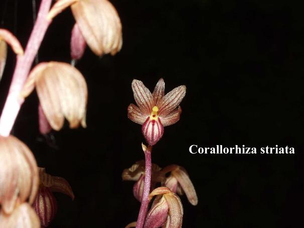 Synonyms Corallorrhiza bigelovii S.Watson 1877; Corallorrhiza ehrenbergii Rchb.f. 1850; Corallorrhiza involuta Greenm. 1898; Corallorrhiza macraei A.Gray 1856; Corallorrhiza ochroleuca Rydb. 1904; Corallorrhiza striata f. eburnea P.M.Br. 1994; Corallorrhiza striata f. flavida (T.A.Todsen & Todsen) P.M.Br. 1995; Corallorrhiza striata f. fulva Fernald 1946; Corallorrhiza striata var. flavida T.A.Todsen & Todsen 1971; Corallorrhiza striata var. involuta (Greenm.) Freudenst. 1997; Corallorrhiza striata var. vreelandii (Rydb.) L.O.Williams 1934; Corallorrhiza vreelandii Rydb. 1901; Neottia bigelowii (S.Watson) Kuntze 1891; Neottia ehrenbergii (Rchb.f.) Kuntze 1891; Neottia striata (Lindl.) Kuntze 1891