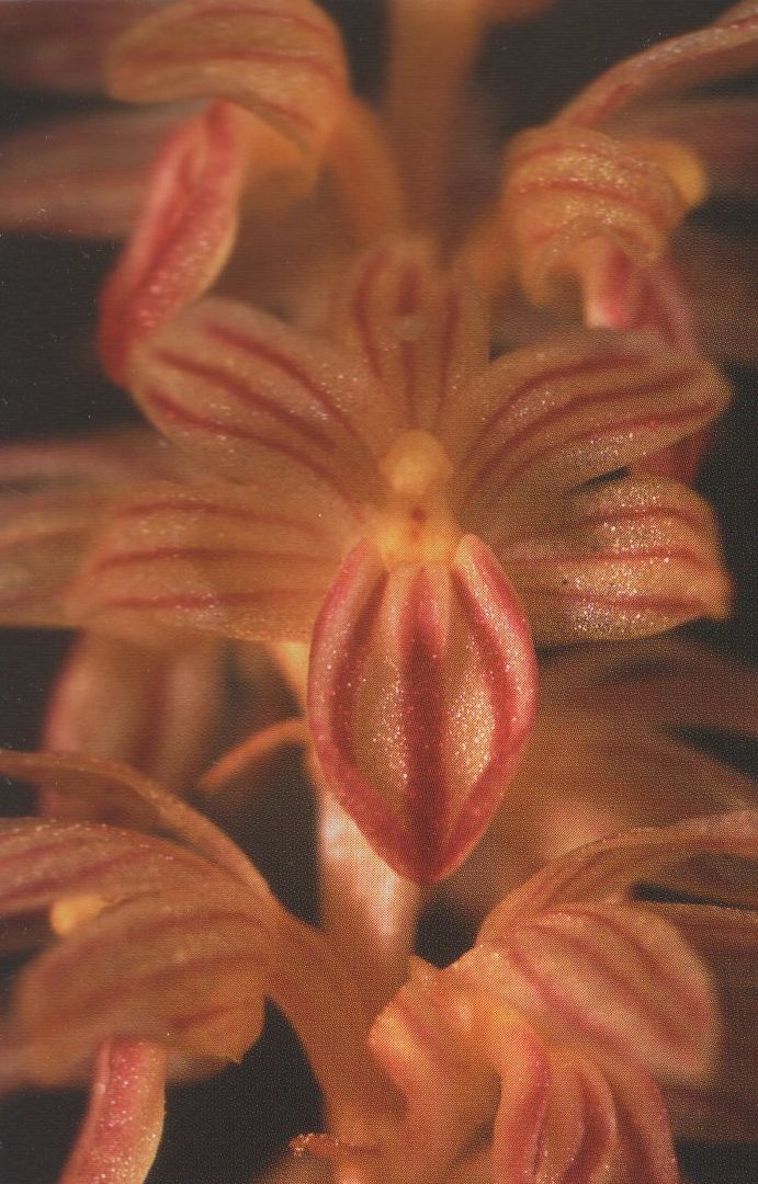 Found in the Western US, Canada and in boggy or wet damp areas as well as Oak/Pine forests at elevations around 2400 meters as a small sized, cold growing, mycoheterotrophic, leafless, terrestrial orchid that blooms in the late spring and early summer and in Mexico in the later summer on an erect, terminal, purple or reddish, glabrous, few to many [5 to 20] flowered, 4 to 12" [10 to 30 cm] long, racemose inflorescence.