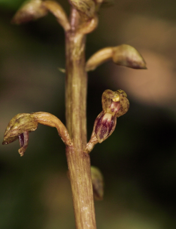 Found in West Virginia and Virginia as a miniature to small sized, cold growing, mycotrophic terrestrial that blooms in the summer on erect, 6 to 8" [15 to 20 cm] long, thicker than others in the genus, rich chestnut to mahogany in color, several flowered inflorescence carrying cleistogamus flowers.