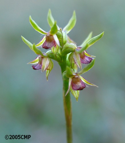 Found in Victoria and South Australia at elevations of 10 to 250 meters in grassy woodlands, heathlands and heathy forests as a mini-miniature to miniature sized, cold growing terrestrial found in poorer eucalypt forests, often with heathy under-story, in sandy or gravelly soil with a single, stem clasping, free part .24 to 1/2" [.6 to 1.3 cm] long leaf ending well below the flowers and blooms in the later summer through fall on an erect, .2 to 1.2" [.5 to 3 cm] long, 1 to 15 flowered, racemose inflorescence.