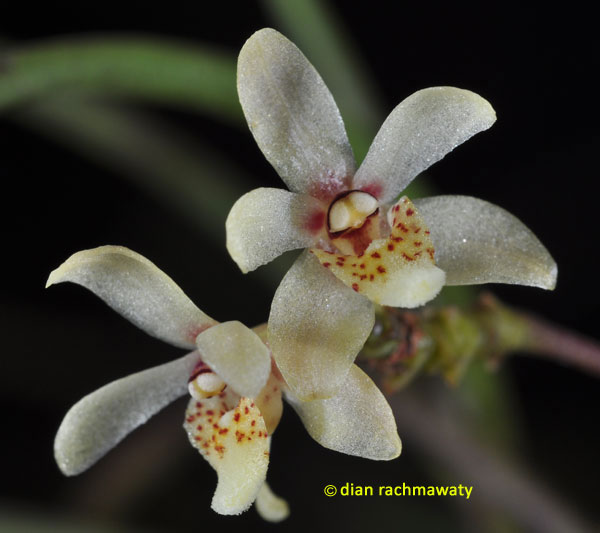 Found in penninsular Malaysia, Thailand, Borneo and the Philippines in lowlands as a miniature sized, hot to warm growing epiphyte with a short stem enveloped completely by imbricate leaf bearing sheaths and carrying a few, terete, often purplish leaves that blooms at any time of the year on an axillary, from near the base of the stem, purplish, slender, to 4" [10 cm] long, several flowered inflorescence with all the flowers held in the apical .8" [2 cm] and held in a loose corymb
