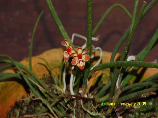 Found in penninsular Malaysia as a miniature sized epiphyte with a short stem carrying a few, terete, often purplish leaves that blooms on terminal, 1.2 to 2.4" [3 to 6 cm], purplish, successively single flowered inflorescence.