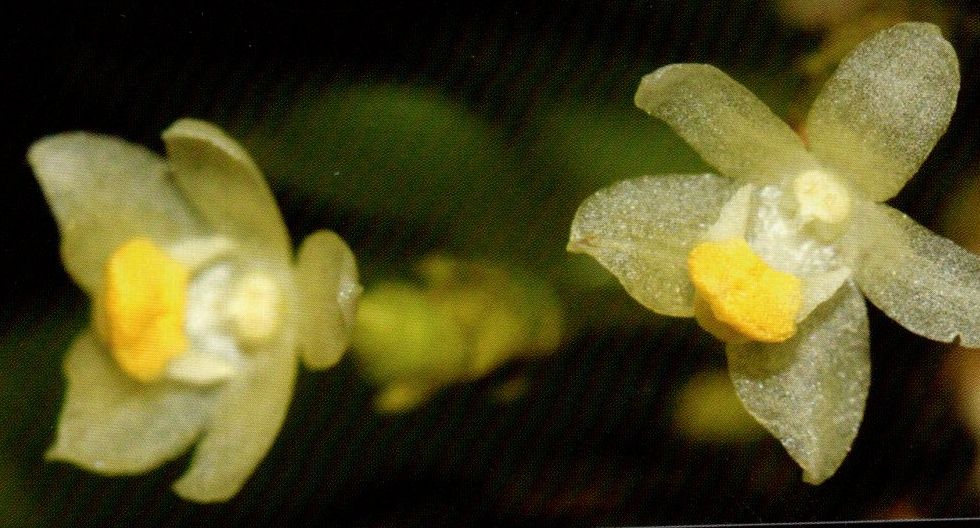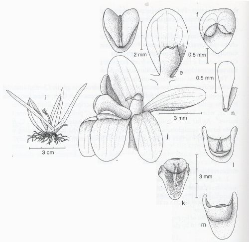 Found in Pahang state of penninsular Malaysia and Borneo as a mini-miniature sized, hot to warm growing epiphyte with laterally flattened, fleshy, longitudinally wrinkled, acute, basal ones longest leaves that blooms on a naked peduncle, to .4" [1 cm] long, prickly, rachis to .12" [3 mm] long, few flowered inflorescnece with broadly triangular, floralb racts and carrying flowers with pale yellow, transluscent tepals and an orange powdery lip with cream colored lobes