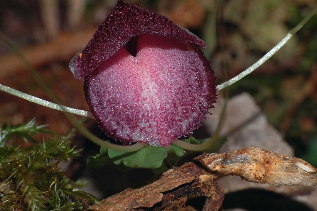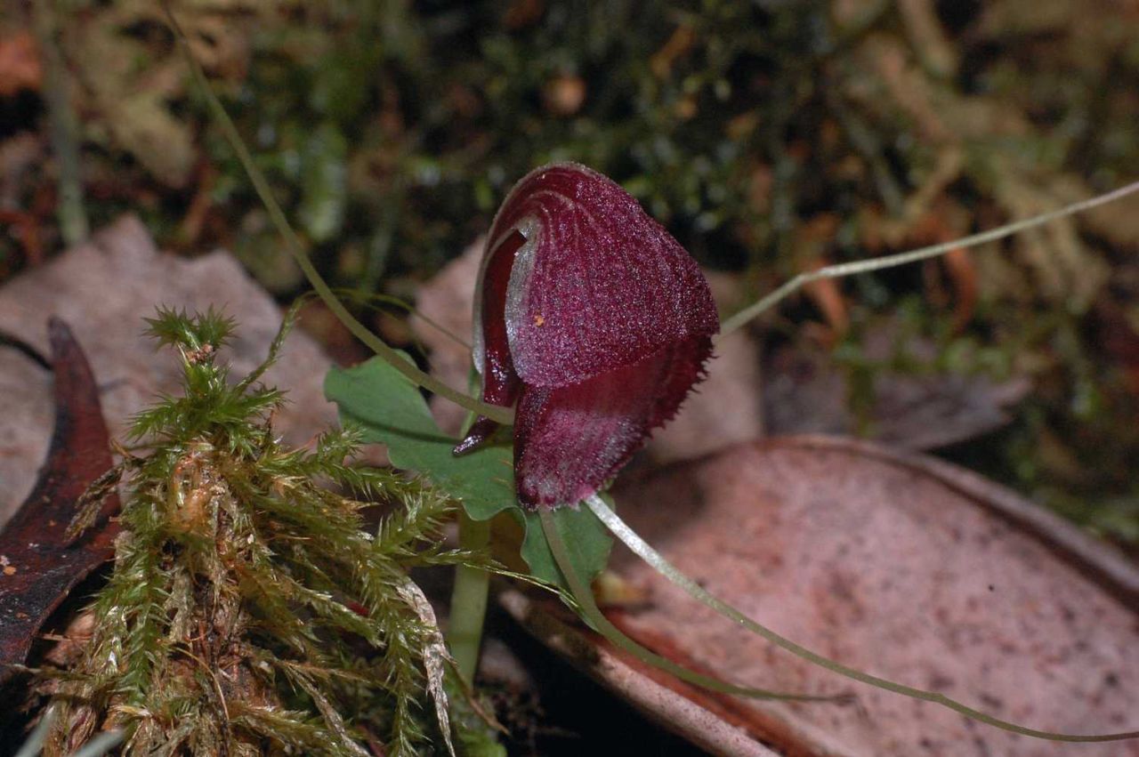 Found in Malayisa, Vietnam and Borneo in lower montane forests at elevations around 1200 to 1900 meters as a mini-miniature sized, cool growing terrestrial or lithophyte with an ovate, subulate-apiculate, green with white veins leaf that blooms in the summer on an erect, single flowered inflorescence