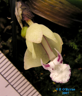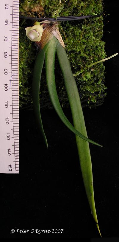 Found in penninsular Malaysia and Sarawak, Borneo in lowland mixed dipterocarp forests at elevations around 200 meters as a miniature to small sized, hot growing epiphyte with a short stem completely enveloped by imbricate, leafless below and leafbearing above sheaths, holding the laterally flattened, slightly curved, acute, attenuate to the sheaths below leaves held in a fan shape that blooms on a basal, very short, single flowered infloresence holding the flower tight against the base of the stem.