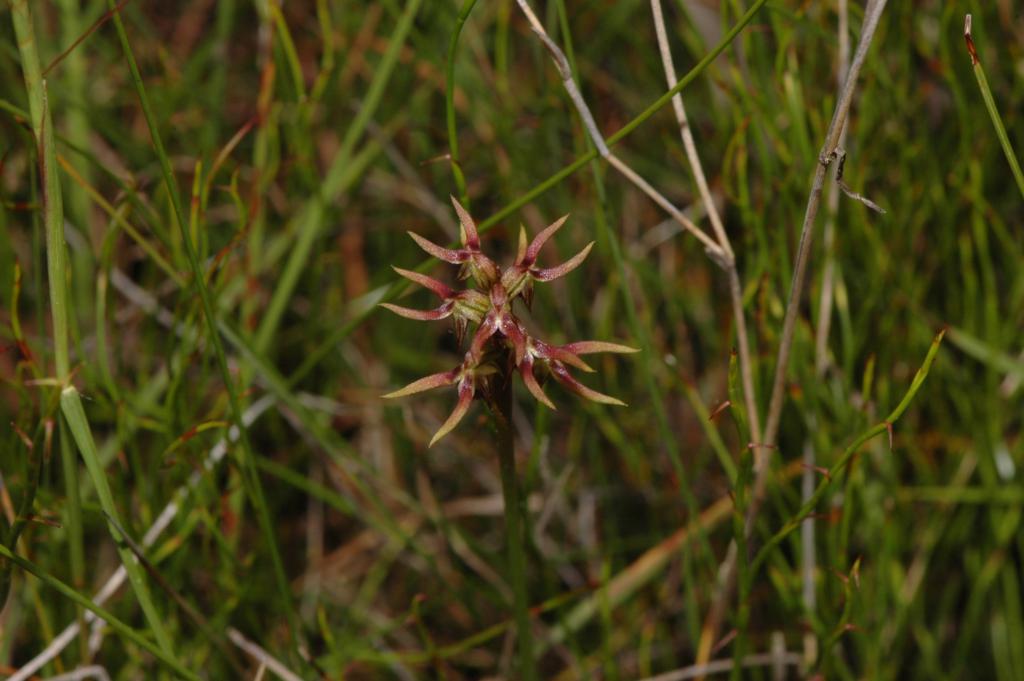 Found in New South Wales Australia close to swamps among shrubs or among grass bordering streams at elevations of 700 to 800 meters as a mini-miniature to small sized, cold growing terrestrial with a single, short, stem clasping, free part .4 to .8" long, almost as long as the flowers leaf that blooms in the spring on an erect, .8 to 1.6" [2 to 4 cm] long, 10 to 25 flowered inflorescence