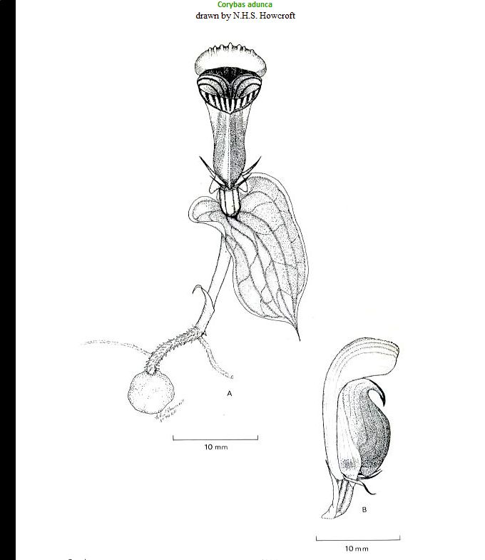 Corybas aduncus (Schltr.) Schltr. 1923 SECTION Gastrosiphon Drawing by © N H S Howcroft and The Papua New Guinea Orchid News Website